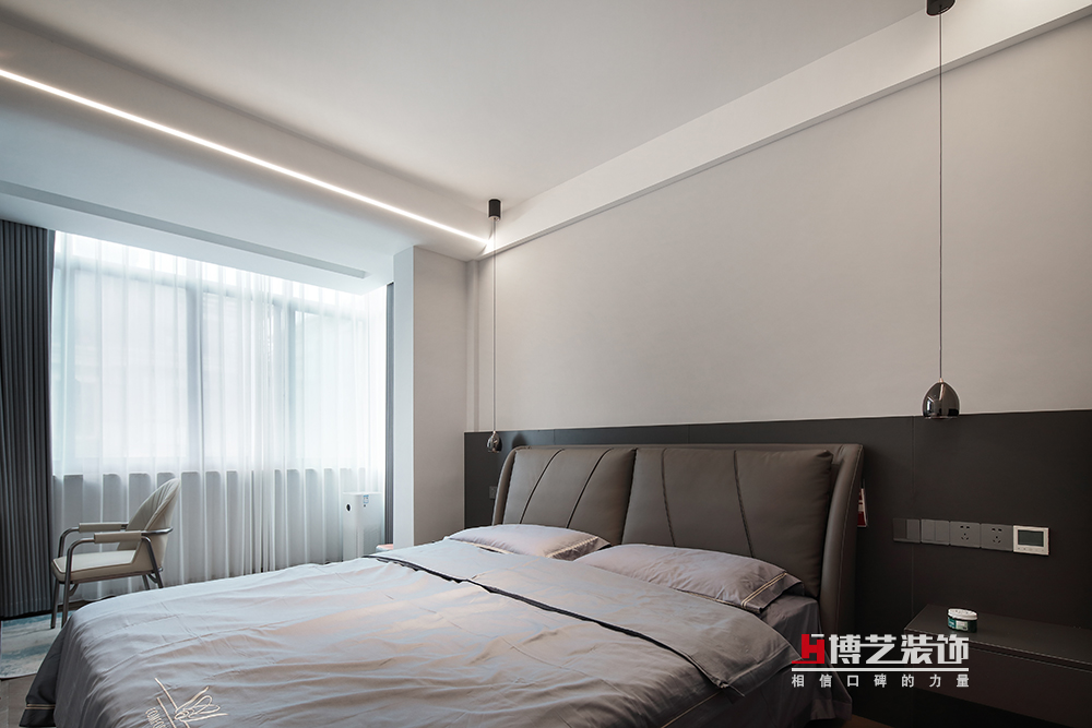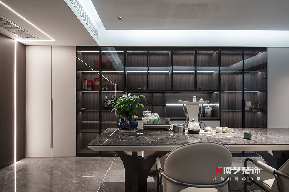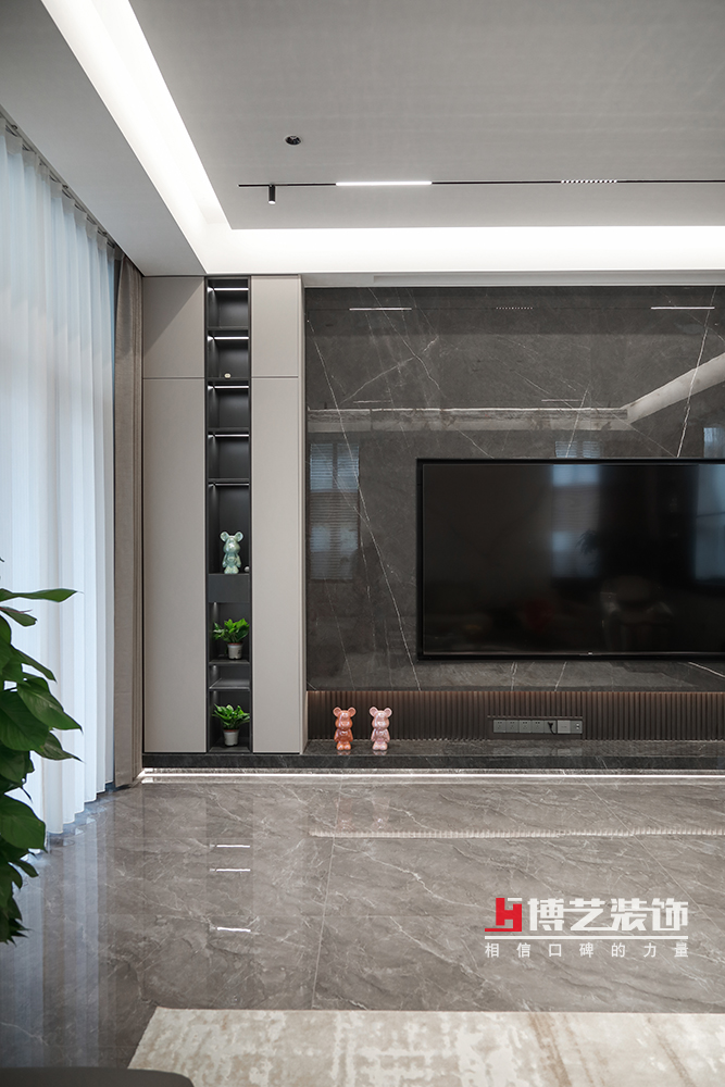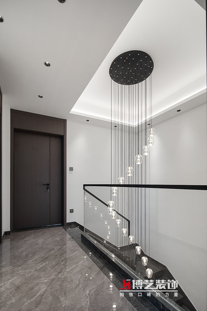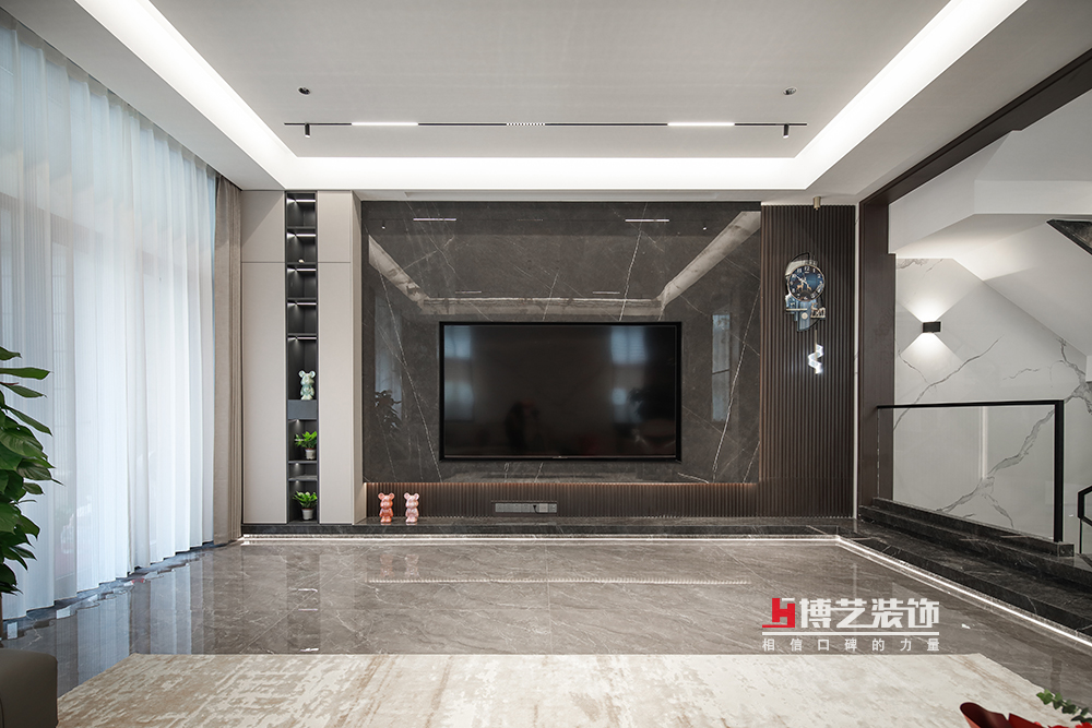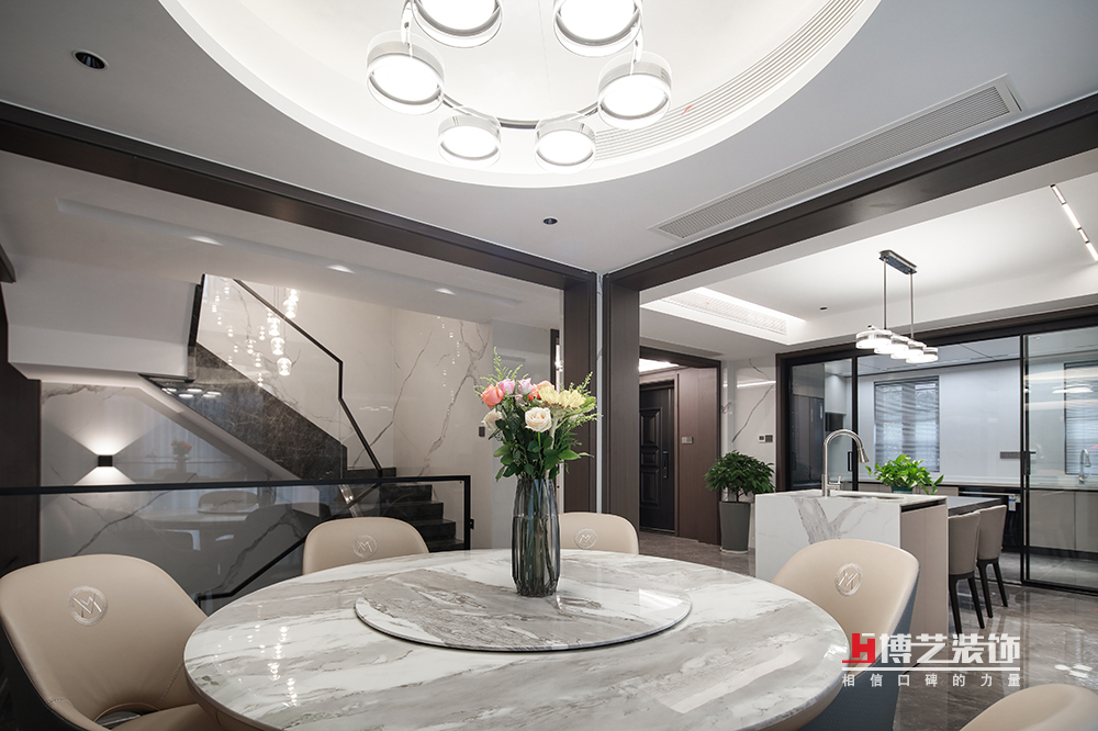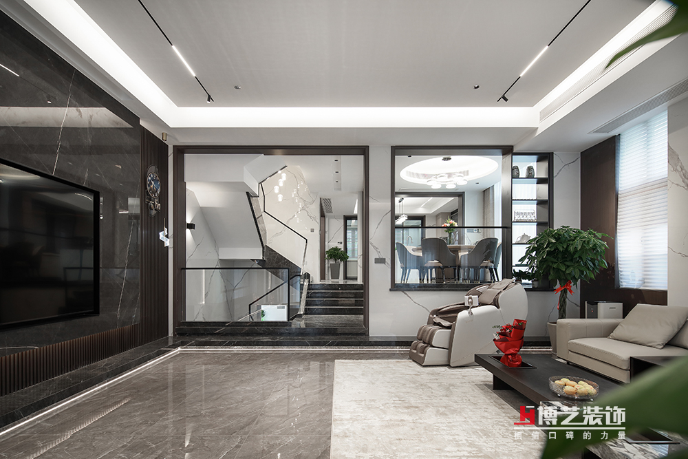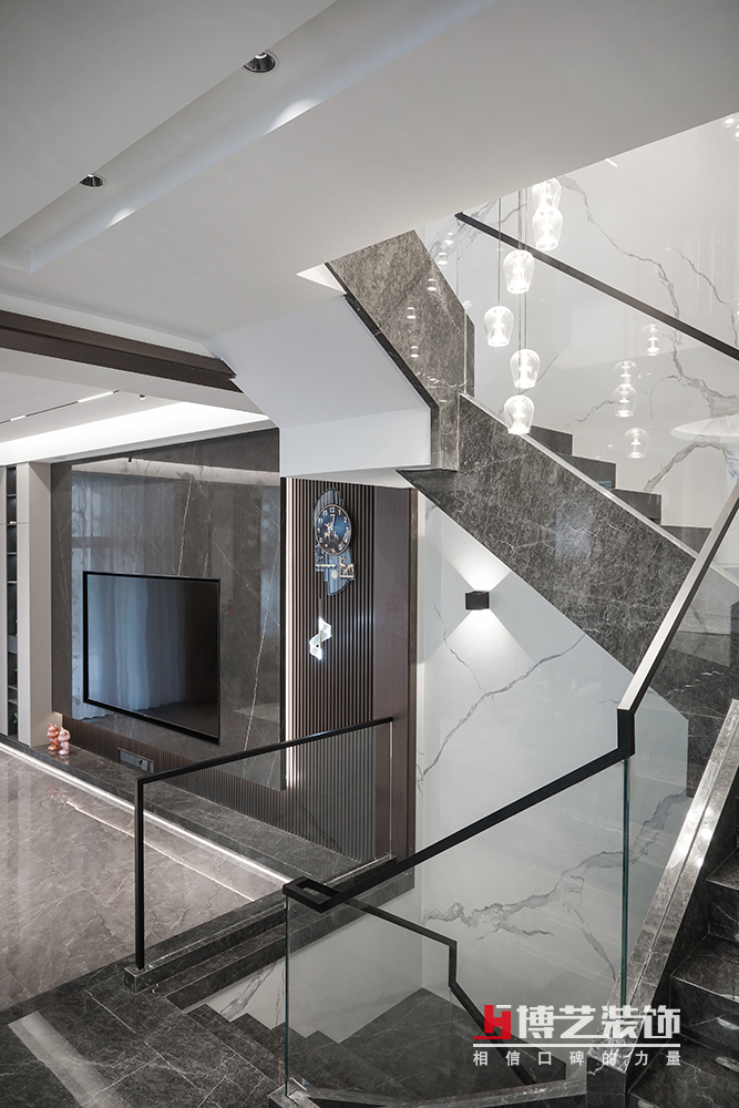 设计师以经典的黑白灰色调入手,调和着现代住宅对于低调质感生活的追求。通过合理运用玻璃,石材,格栅,不锈钢,布艺,皮质等不同材质,融合进整个一楼公区。无主灯的设计搭配下沉式空间,让整个客厅区域彰显气质。电视机的黑色大理石背景和沙发的白色大理石背景遥相呼应,在黑白之间,打造无限延伸的空间感。