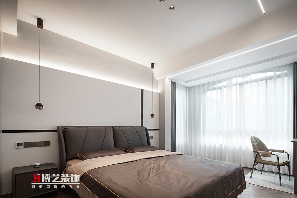 主卧用了一整个大套房的设计,休息区,收纳区,洗漱区,晾晒区,小憩区,安排得井井有条。整个色系布置都静谧宁静,用白色为主基调,掺进细腻的奶咖色,平添了层次感,让空间一下柔了起来。