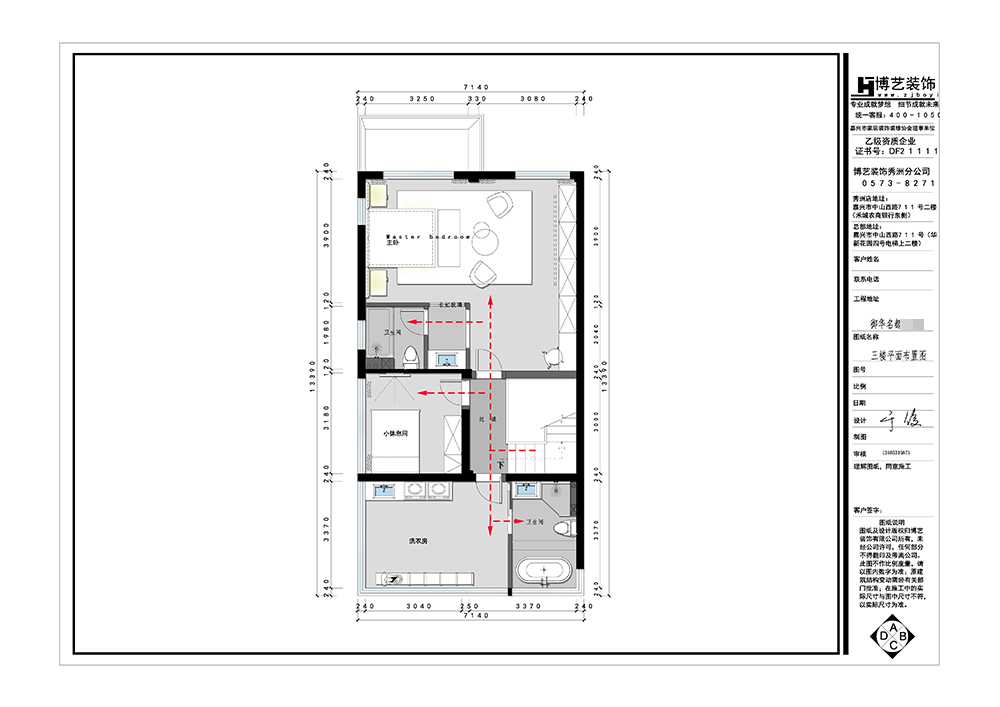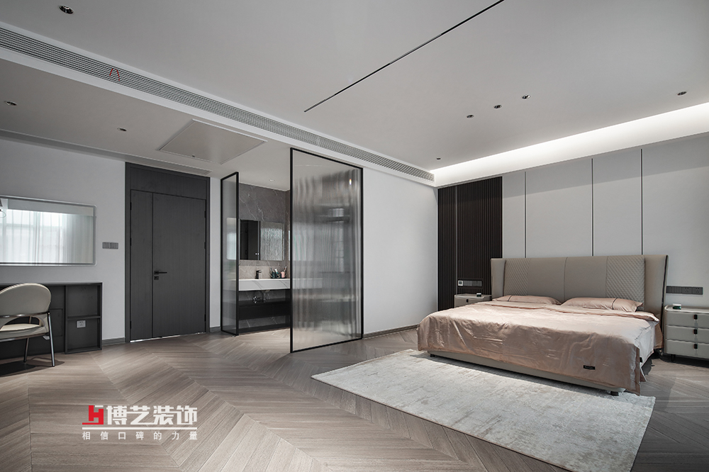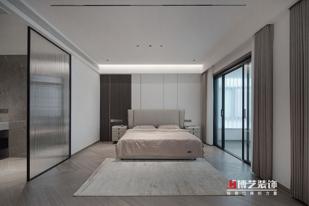 三楼则是做了一个主人的大套房设计,主卫做了干湿分离,干区用长虹玻璃进行隔断,增加整个干区采光。在床尾设置了简单的工作区,偶尔可以安静办个公。在主卧外,还涉及了一个小的休息间,可供平时偶然午休打个盹。北面空间则留做了洗衣房和浴室,泡完澡直接进把洗漱完的衣物留在洗衣房,动线一气呵成。