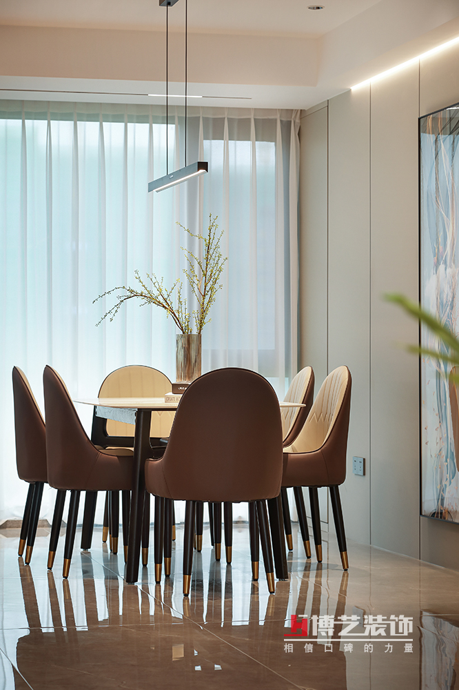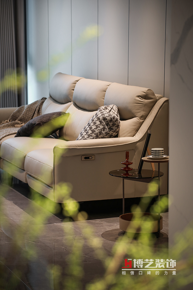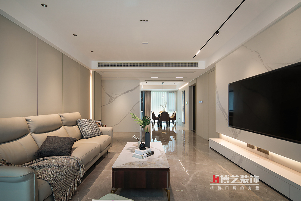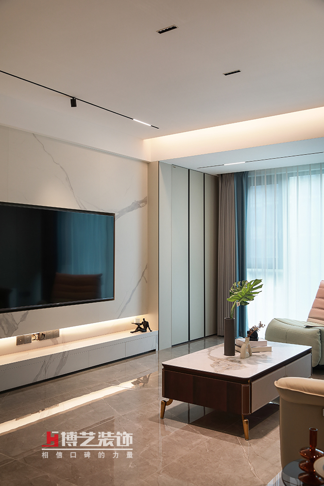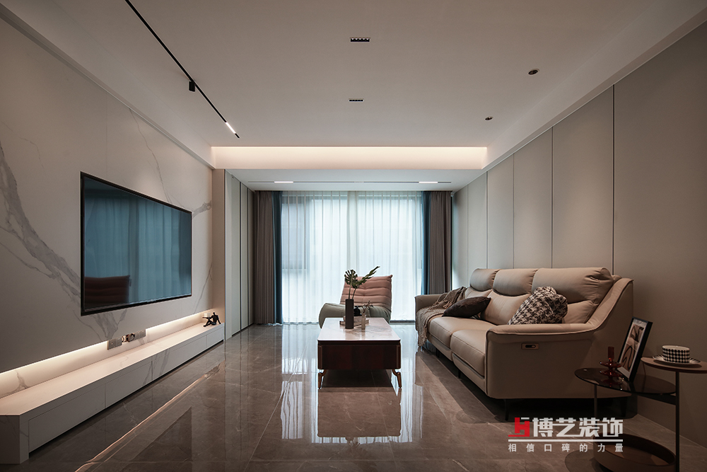 整个客厅空间以米灰色为主色调,岩板的电视背景,木作的沙发背景,通铺的大理石砖,都以独特的哑光质感,述说空间的温润气质,烘托家庭生活浪漫温馨的场景。