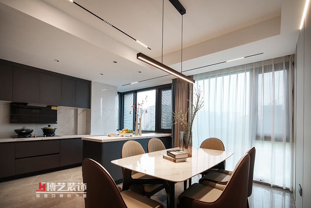 极佳的采光和温馨的就餐环境,让这片区域变成了一个互动空间。孩子在这里做作业,妻子在厨房准备晚餐,丈夫在岛台洗切准备,一切都是岁月静好的模样。