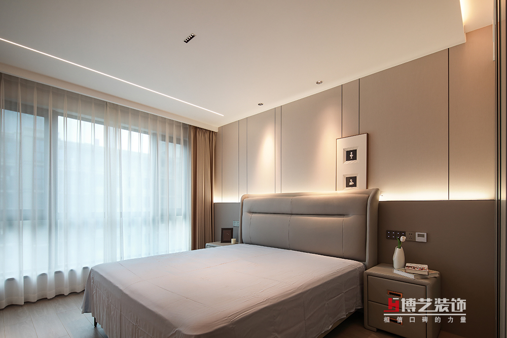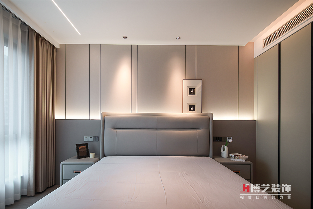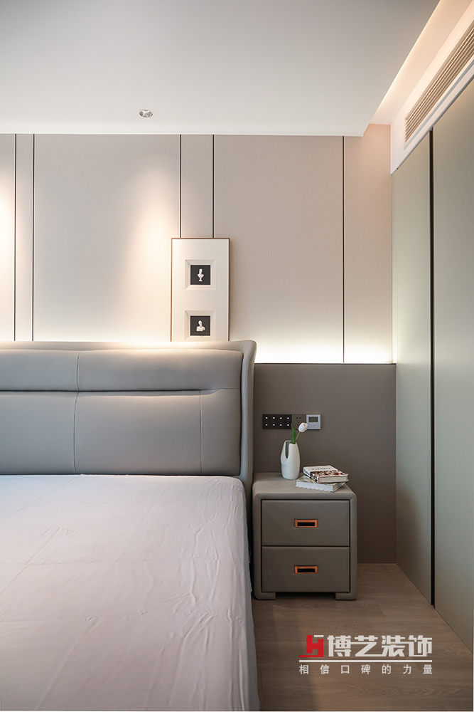 主卧采用了套间的设计,延续了整个家的风格,让整个房子更加统一。高级灰的床品,整个视觉触感都让人全身心放松。