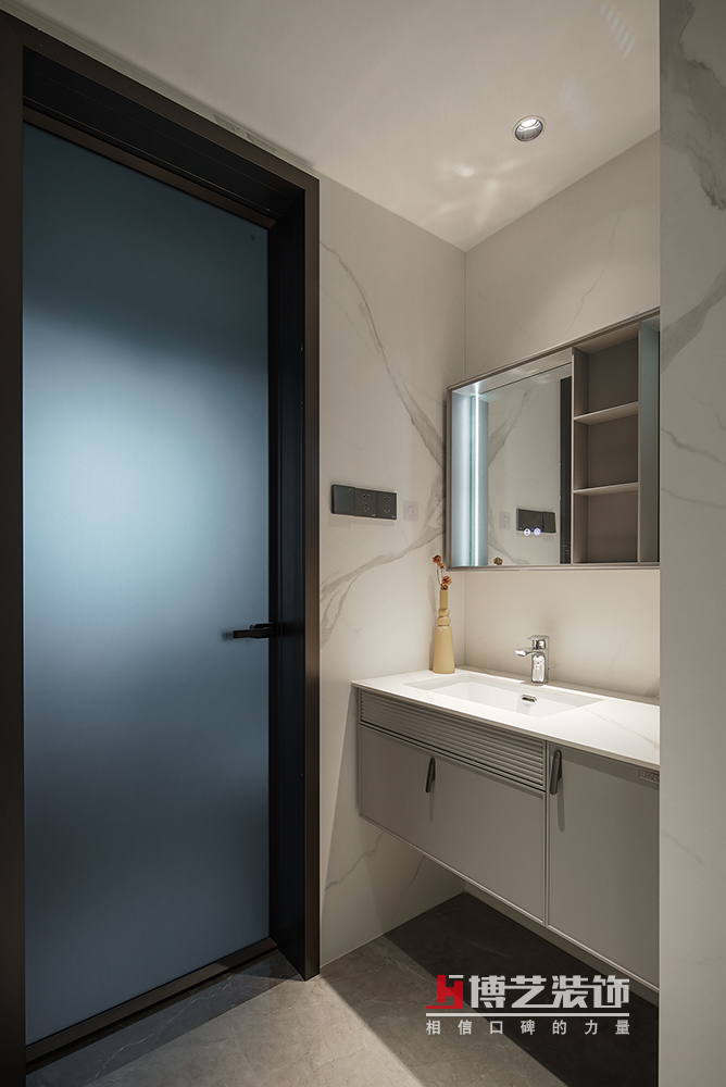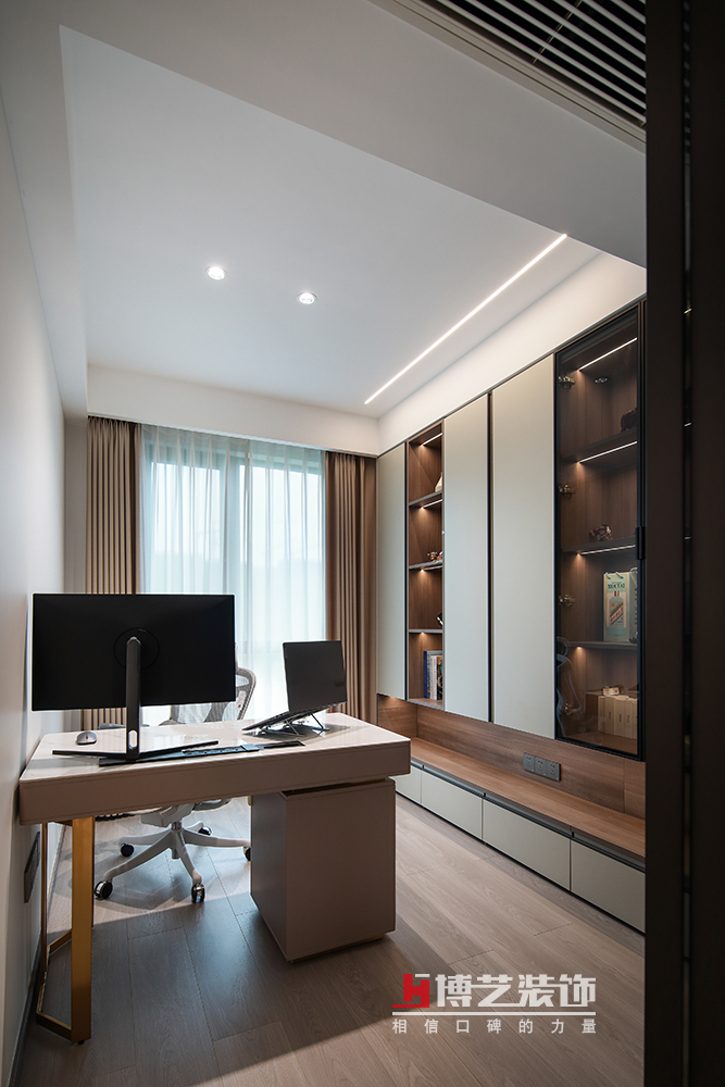 书房用一道移门隔断,更好地融入到主卧套间,将功能和空间做到最好的融合。既是工作时的自由天地,也是休闲时的放松之所。书柜用不同颜色门板,开放格和玻璃等进行展示,配合灯光,既保证了功能上的实用,也打破了整排书柜的沉闷。