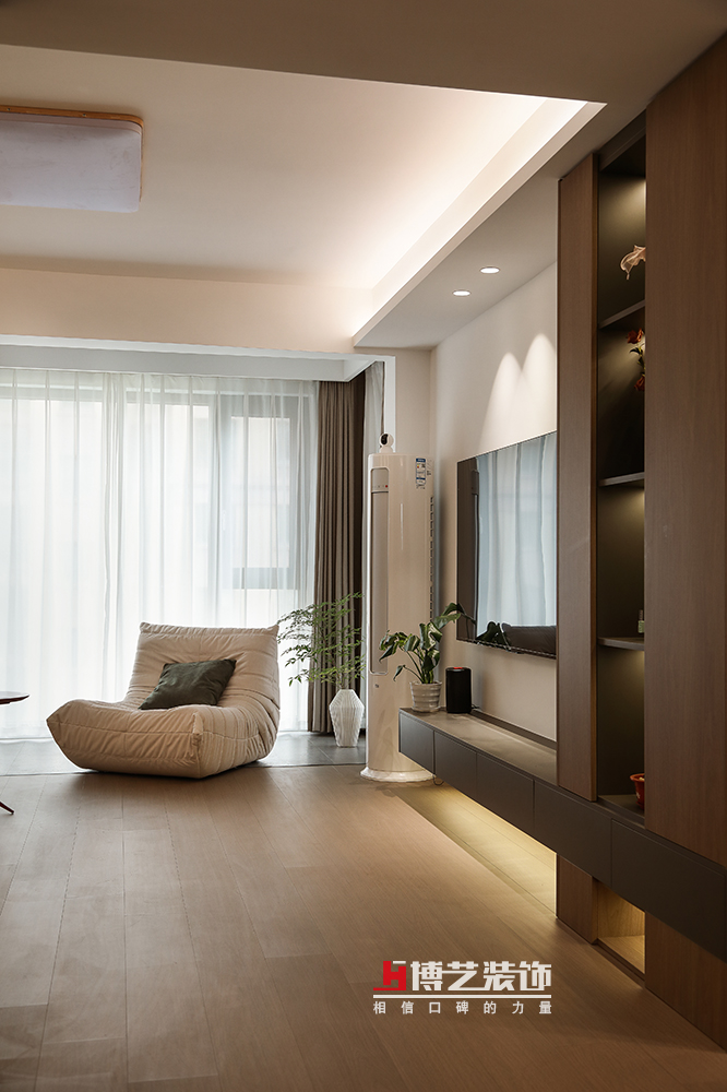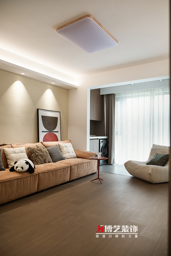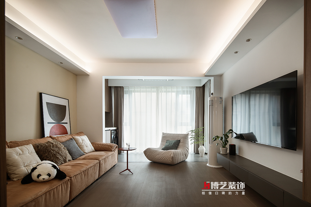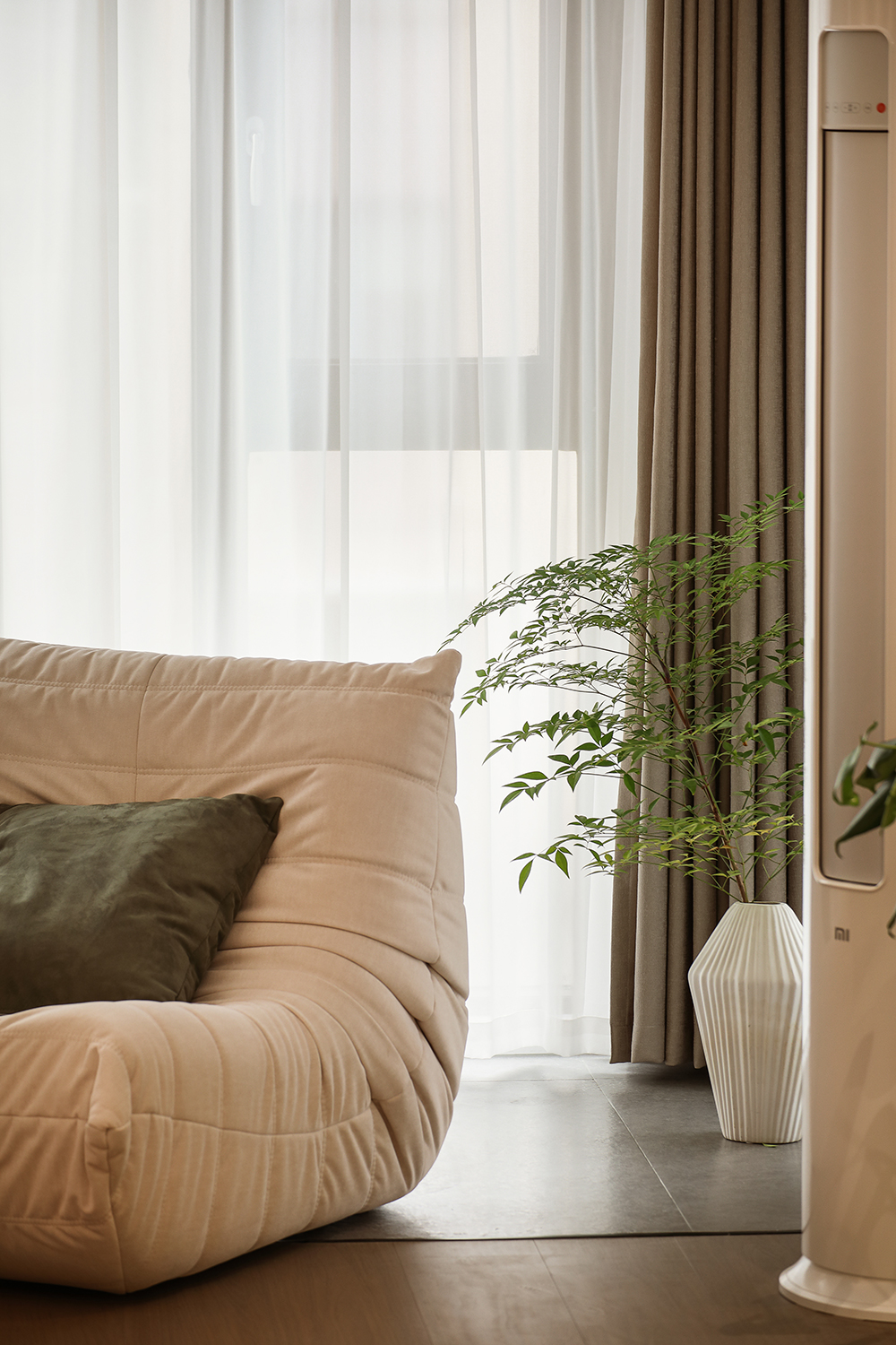 打通了南阳台,把餐厅往内移,客厅一下从视野上打开。选用了大面积的米色墙面,营造宁静而柔和的氛围。全屋通铺地板,以及同色系柜子,搭配去茶几化的设计让客厅更具松弛感。