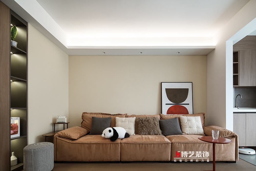 沙发后背悬放的艺术画作,红与黑的碰撞,质朴的风格和简单的色系,起到了点睛作用,一个大红色的边几一下成为客厅的视觉中心,又与画作互相呼应,偶尔放个水果,喝个咖啡,功能足够,同时又不显得凌乱。沙发上三盏射灯射下,客厅也一下有了仪式感。