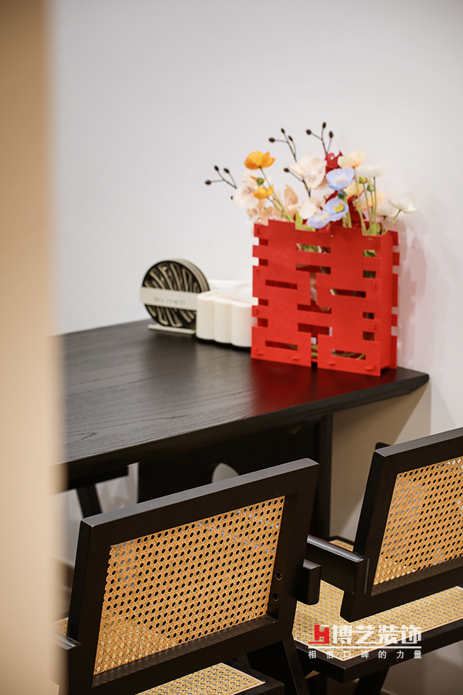 把西厨和冰箱位置安置在了餐厅,上面整齐的陈列展示着主人一家的生活品味和知性情趣。随处可见的喜字也宣告着主人甜蜜幸福的婚姻生活的开启。