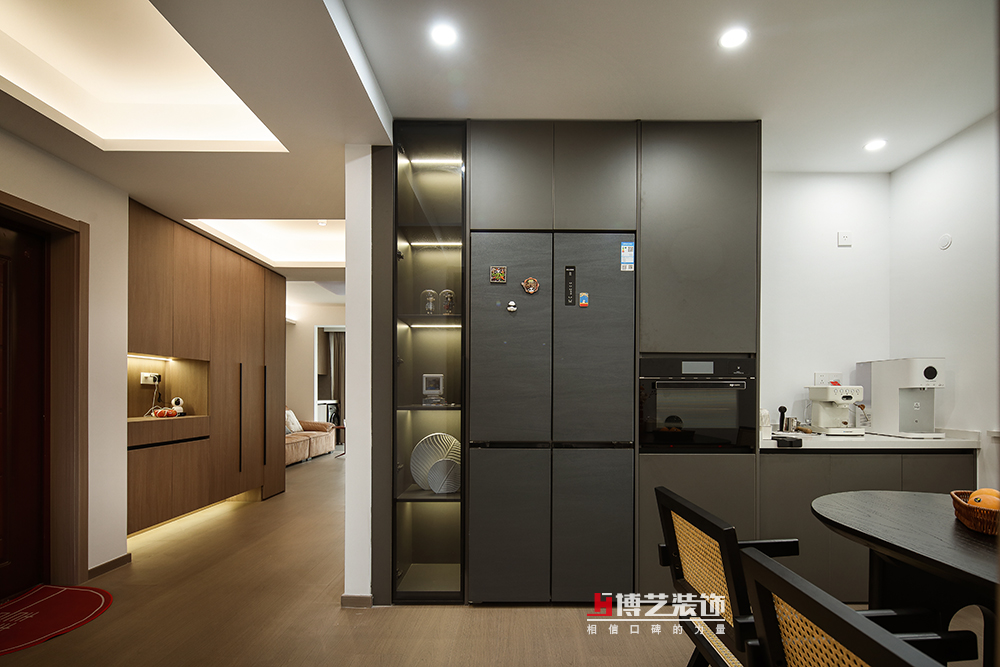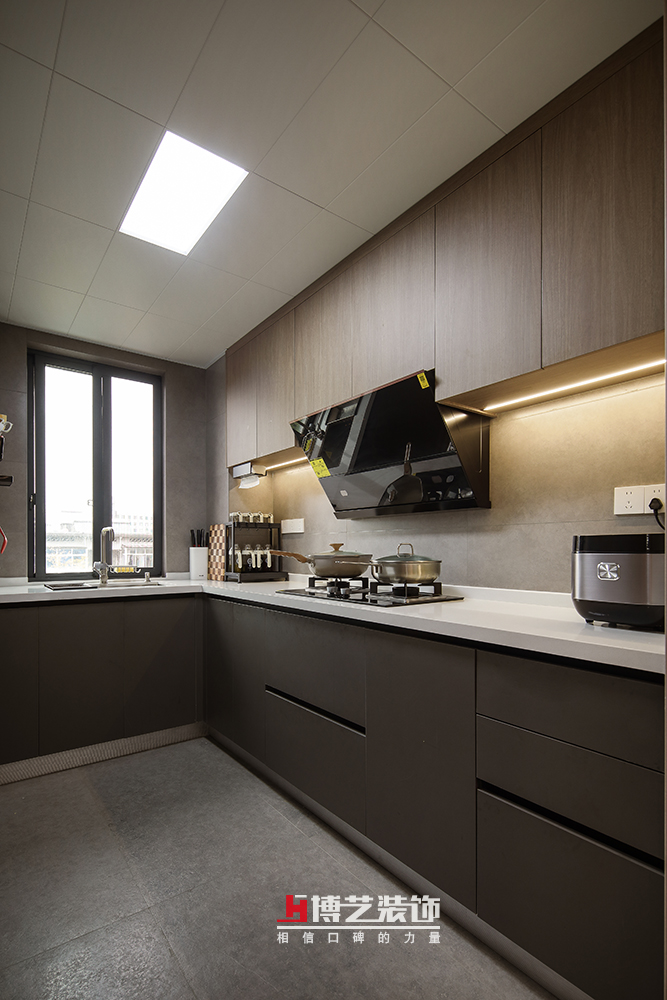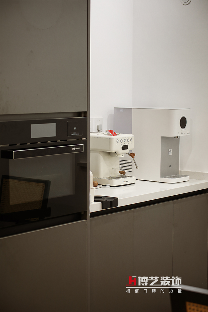 把冰箱挪出厨房后,厨房面积也一下开阔了,木色的橱柜面和白色的台面在灰色的墙面背景下相映成趣,营造了干净整洁的烹饪环境。