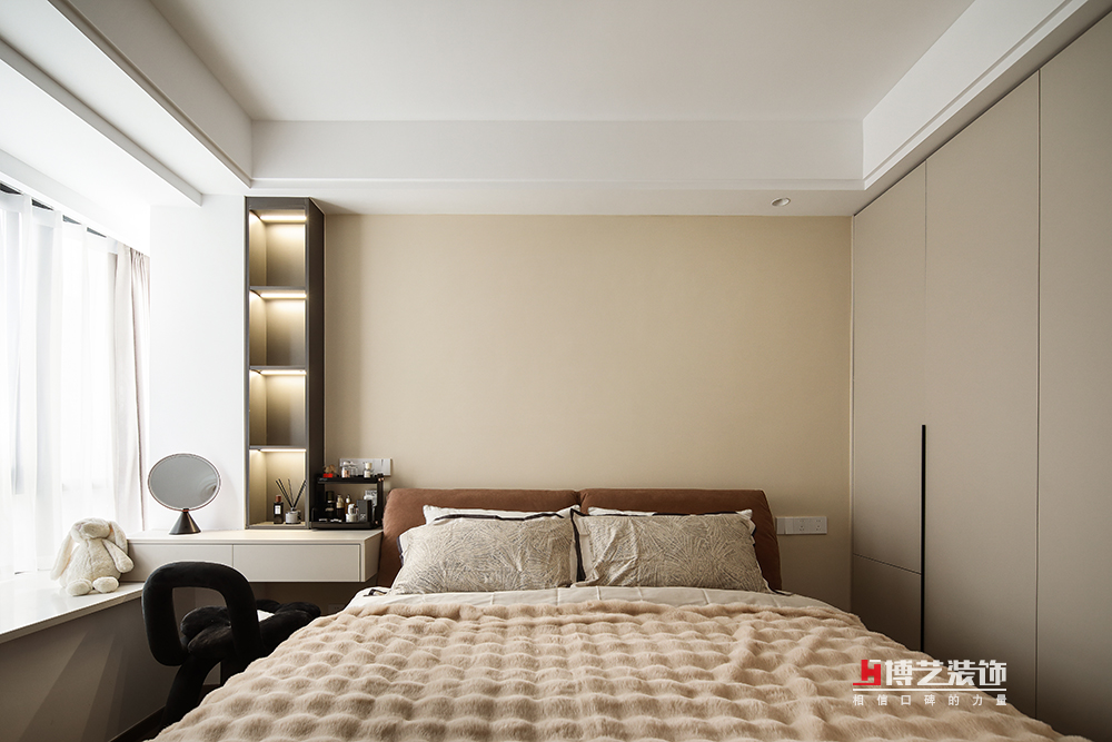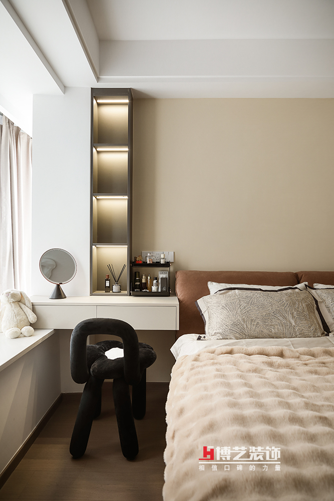 主卧色系延续了客厅的奶茶色系,静谧柔和。主卧利用了飘窗位,一个专属女主人的化妆间就应运而生,在黑与白的空间里,是女主人对美的极致追求。