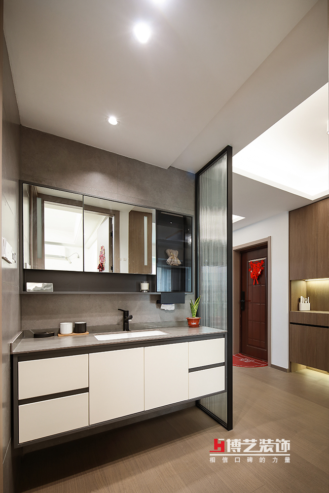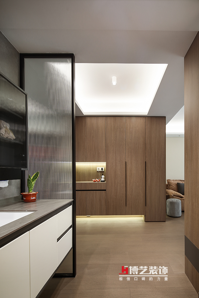木质地板的自然纹理和光泽,给整个家居带来了沉稳的基调,公区与卫生间之间用了长虹玻璃门,透光的同时,兼顾了美观。