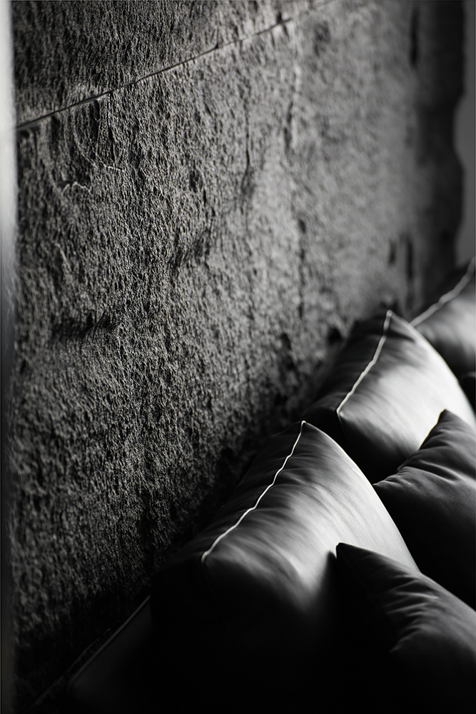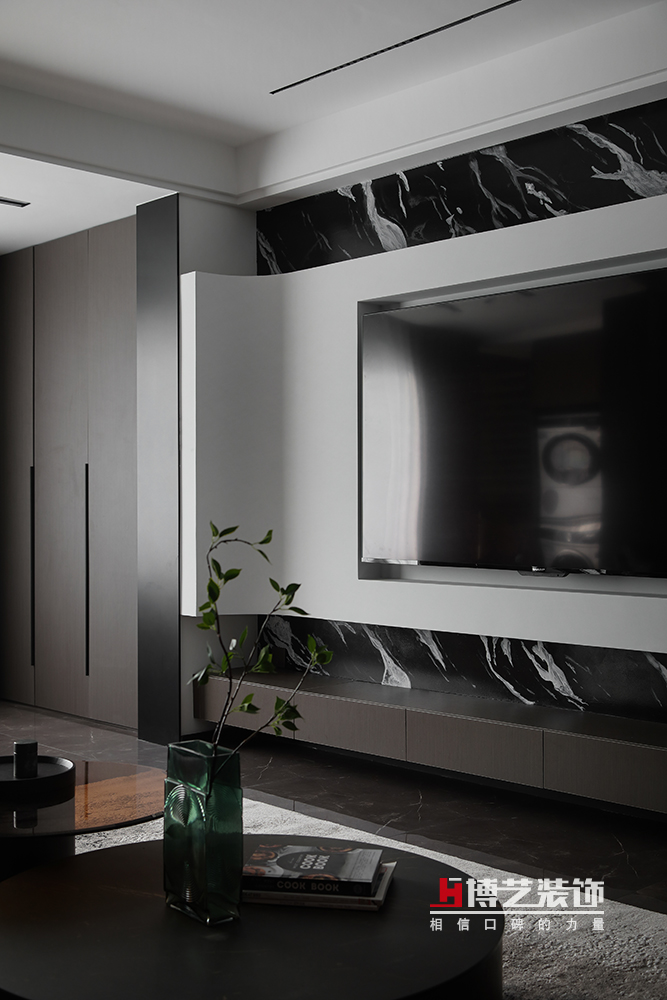 为了不让暗黑系显得过于压抑,客厅选择了白色的电视背景墙来进行中和。柔软的布艺抱枕,舒适的绒质地毯,也让客厅的温度一下回温。同色系的木饰面和石材的搭配,柔和中带着原始的碰撞,艺术感拉满。