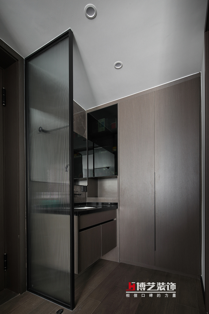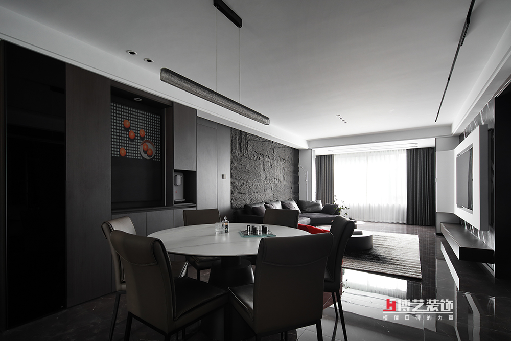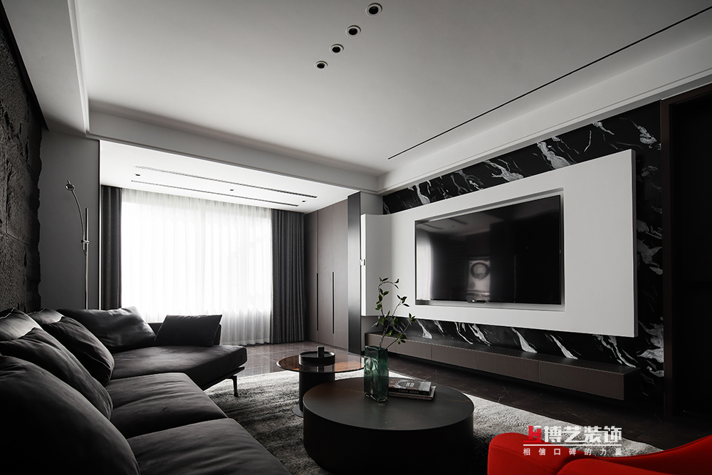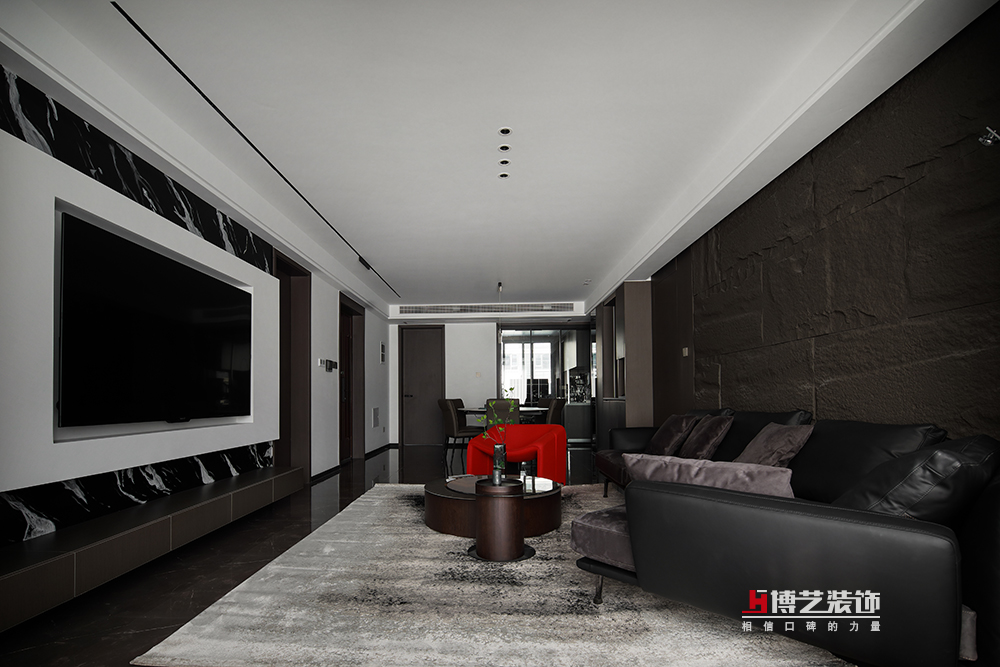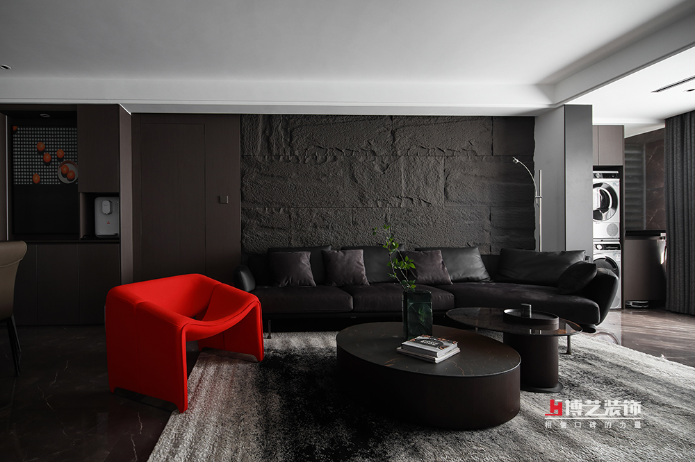 整个色调选用炫酷,个性的暗黑系为主色调,将整个黑色系大胆地从地面延生到墙面,深色调的安静包容与轻奢高冷在这里展现的淋漓尽致。