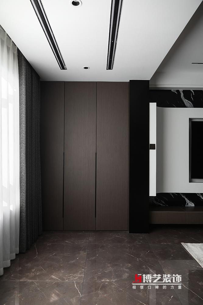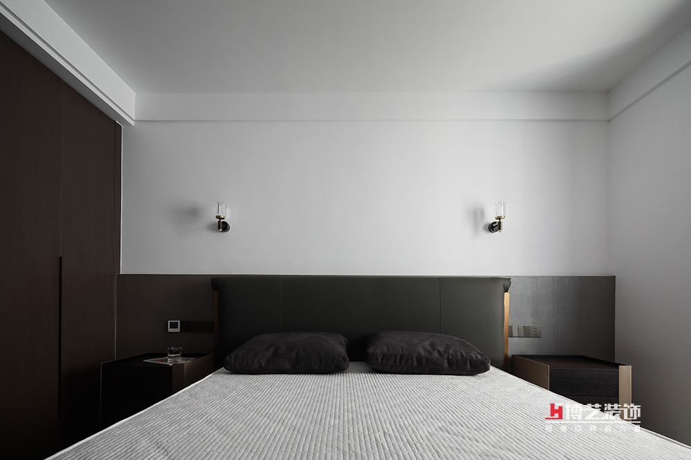 主卧延续了整体暗黑系的风格,打掉了飘窗,尽可能的拓展了空间,同时也让光线更好得融入,并尽可能的做好收纳。黑色的床背和窗帘搭配白色的墙面和天花,在黑与白的世界里营造一个安静且不昏暗的清静环境。