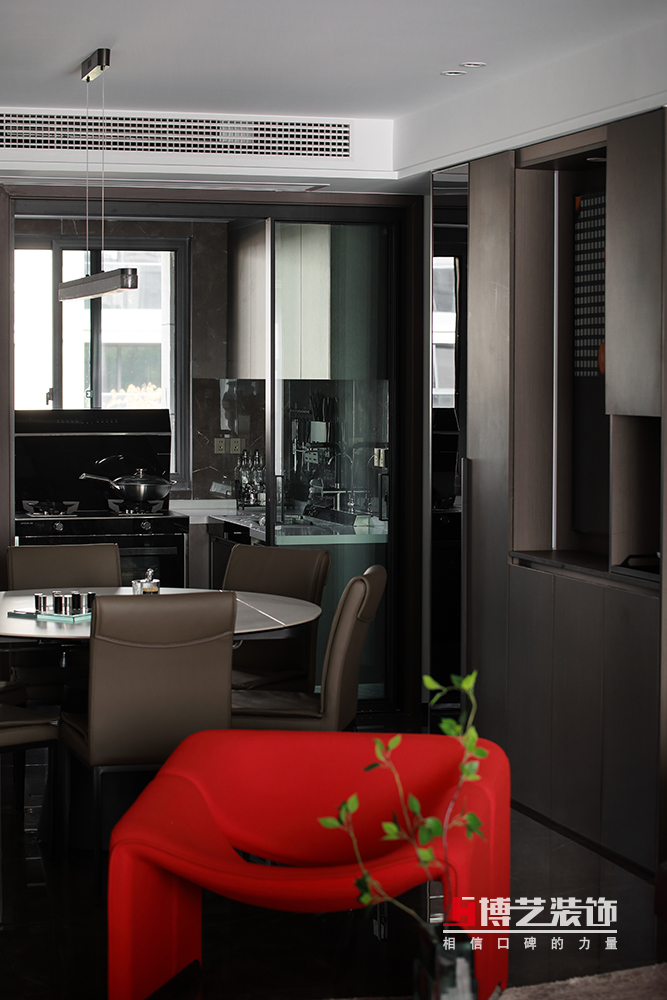 一组餐边柜担当了餐厅收纳的重要角色。点睛的装饰画与客厅火红的单椅互相照应,互相对话。