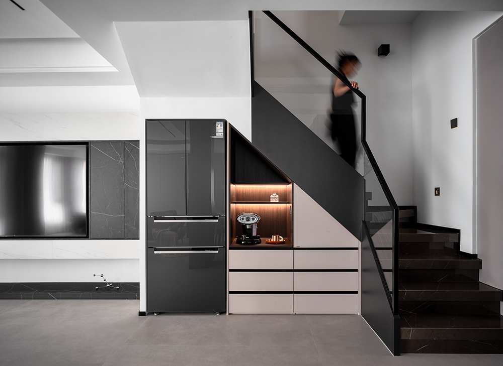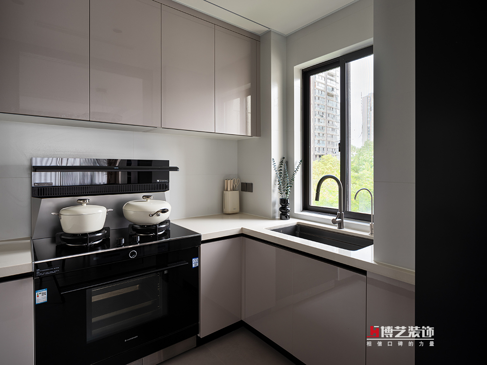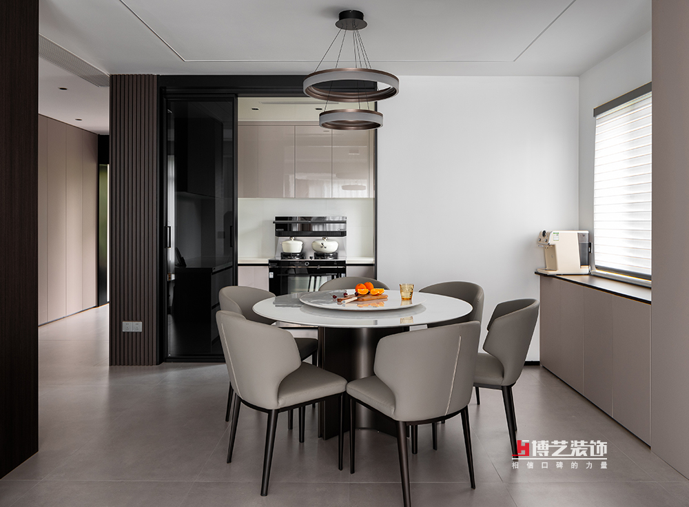 改变开门方向之后的厨房与餐厅联动,以移门分隔。朝东的窗户采光极好,搭配现代极简的设计营造出明亮而惬意的用餐环境。
