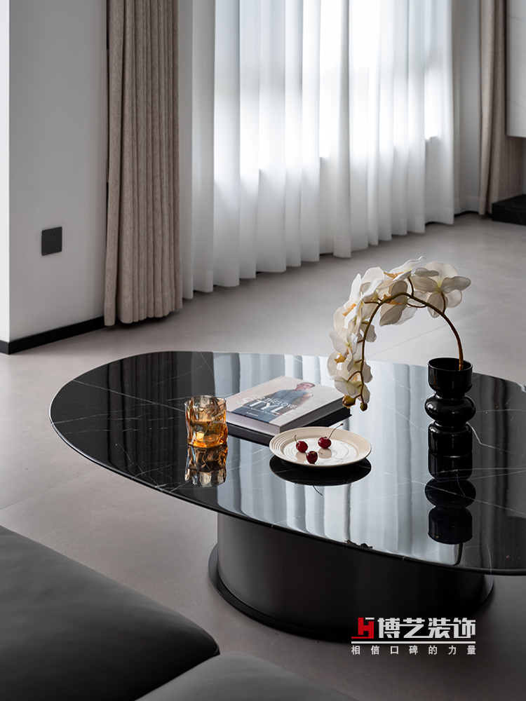 柔光灰色地砖作为地面的基础色,从白墙到深色家具有了更好的衔接和过渡,也让整个家看上去更加柔和。让一黑一白,硬朗柔软在这个空间形成反差,也和谐共处。