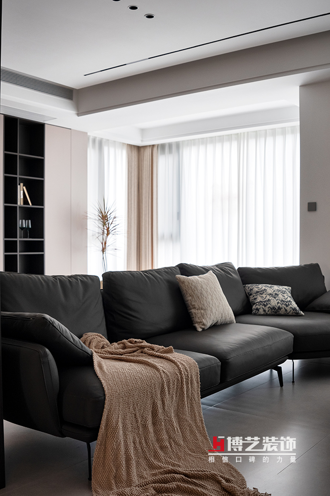 黑白灰的主色调让整个空间看上去干净清爽,将阳台打通之后客厅空间一下子就通透了起来。充沛的光照与黑白灰的空间开始光与影的追逐,在寂静中注入活力,搭配上绿植,原本黑白的空间马上就精致生动了起来。