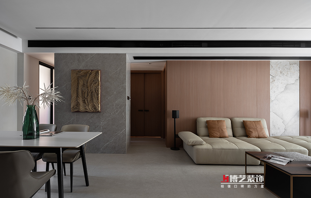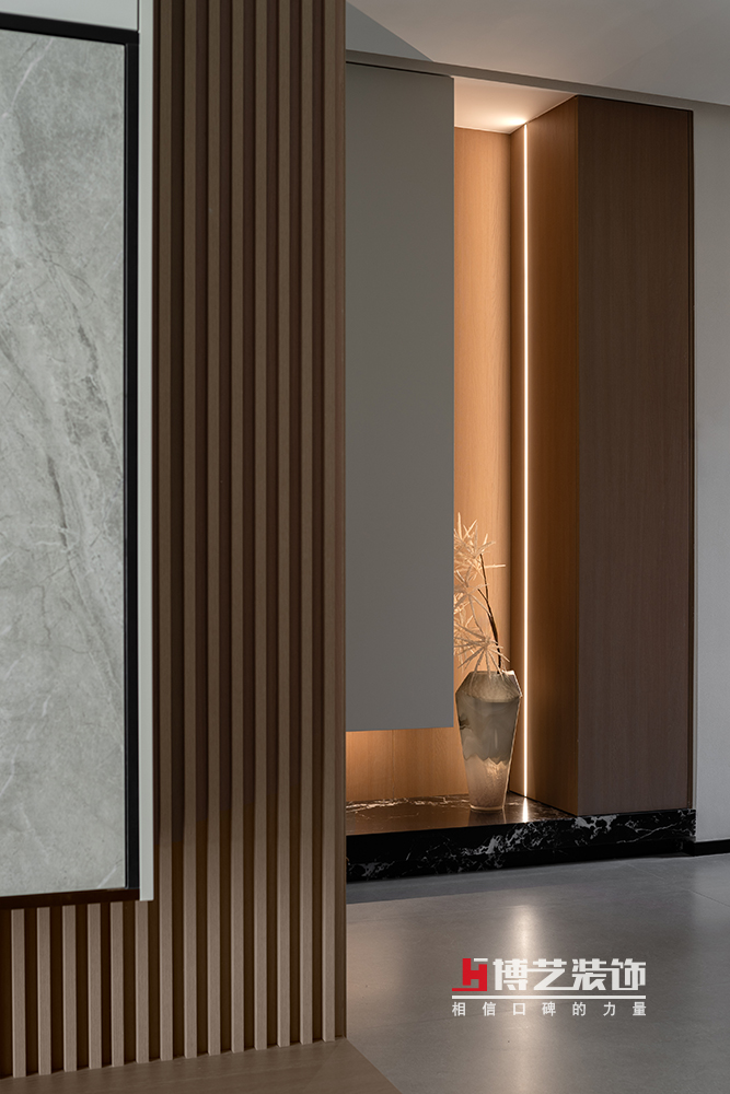 挑选一个有趣的摆件让归家的仪式感从进门就开始升华,也给客人留下温暖的第一印象。通过自然光线到灯带光的过渡,以光为引,绕过弧形饰面,缓缓进入客厅,在视觉上形成了缓冲,又让整个空间有了延伸感。