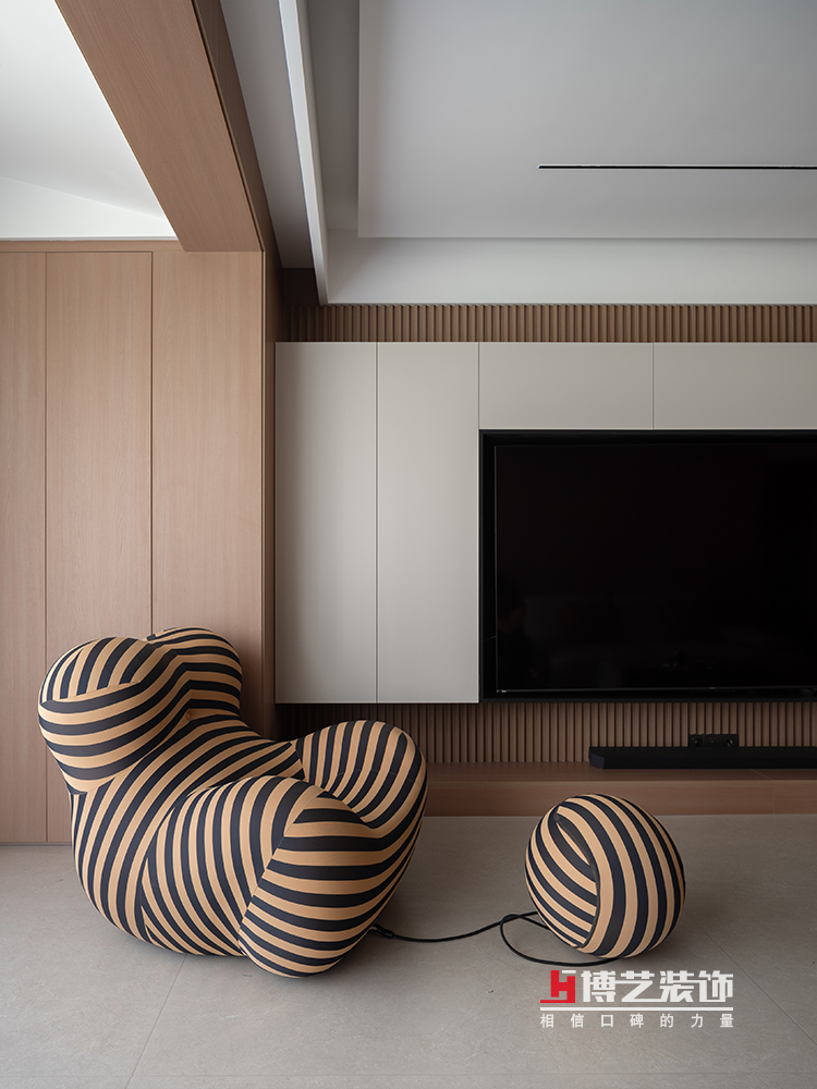 客厅采用现代意式的设计理念,以原木色,灰色,白色为主色调,使用线条和简单的纹理,丰富了客厅层次的同时,让整个空间更简洁、实用,也表明了主人追求效率和功能性的生活态度,也给人一种轻松、无压力的放松感。