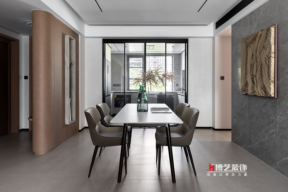 餐厅位置是整个空间的第一个洄游动线,整个动线非常流畅。餐厅采用灰白色调,以光影的自然过渡形式视觉上的舒适感,小面积的黑色和金属色来点缀,提升空间立体感。创意感的装饰画为餐厅增添一丝温暖和深度,平衡了空间的冷硬感。