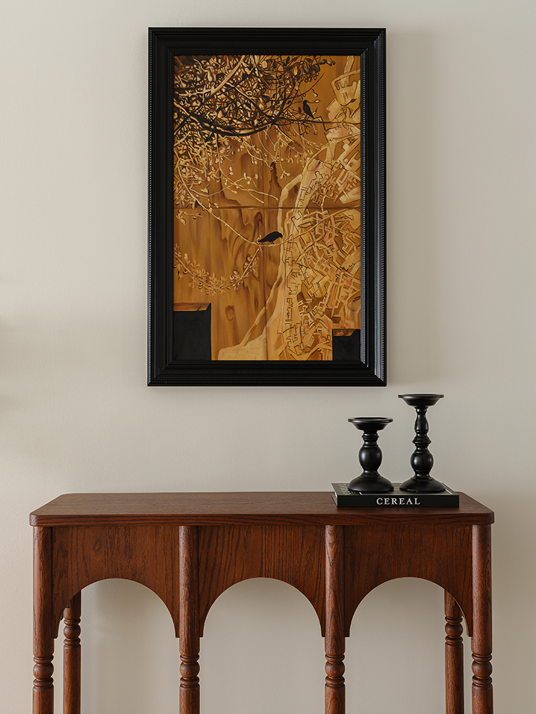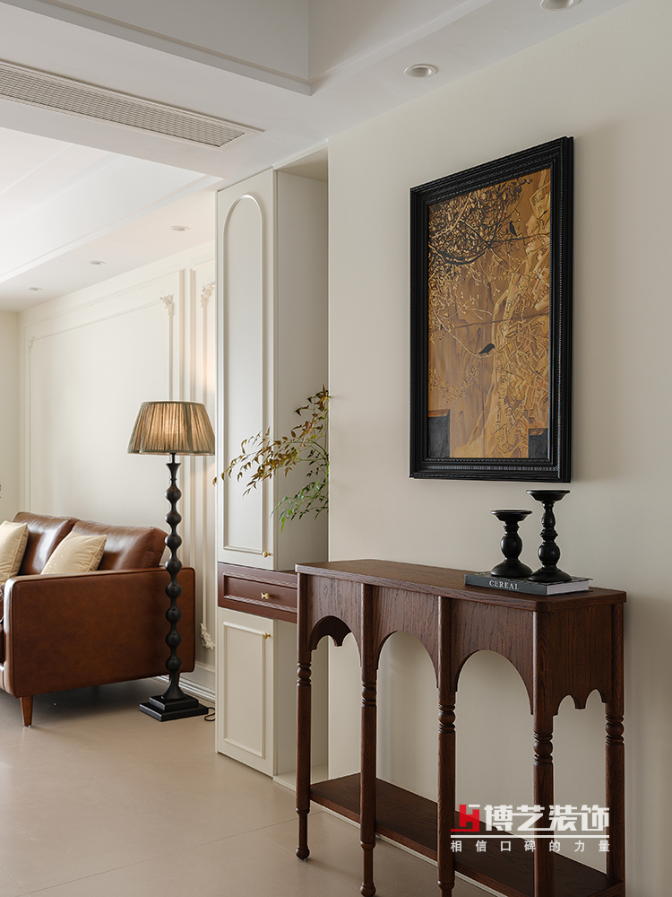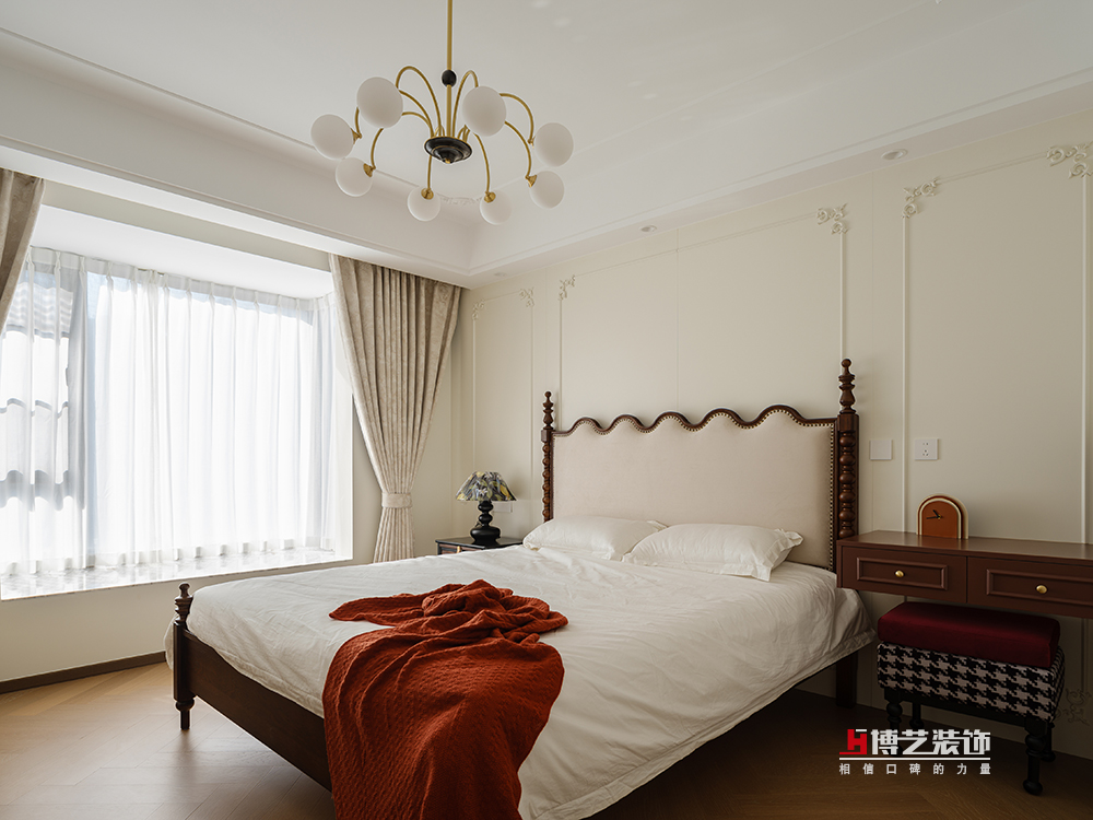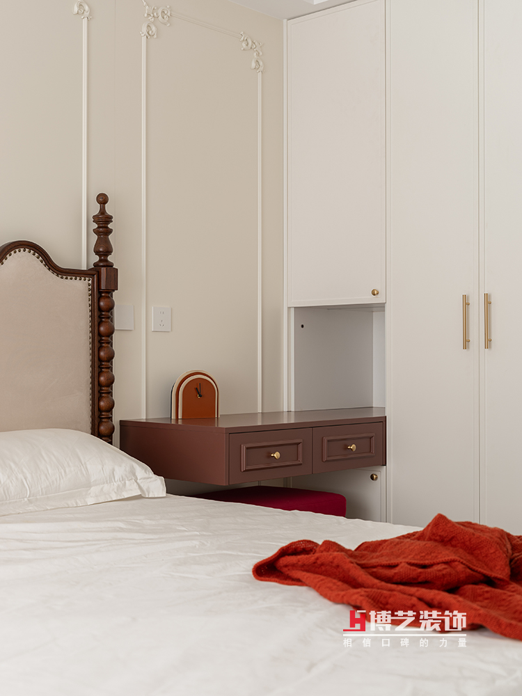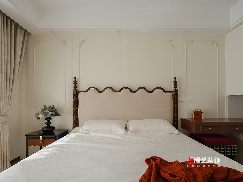 主卧延续了公区的风格,以中古色和奶油色为主色调,中古的床,每一道木纹,每一条雕花,都透露出一种经过时间洗礼的沉稳与雅致,让人在踏入这个空间的瞬间,便能感受到一种宁静的力量。