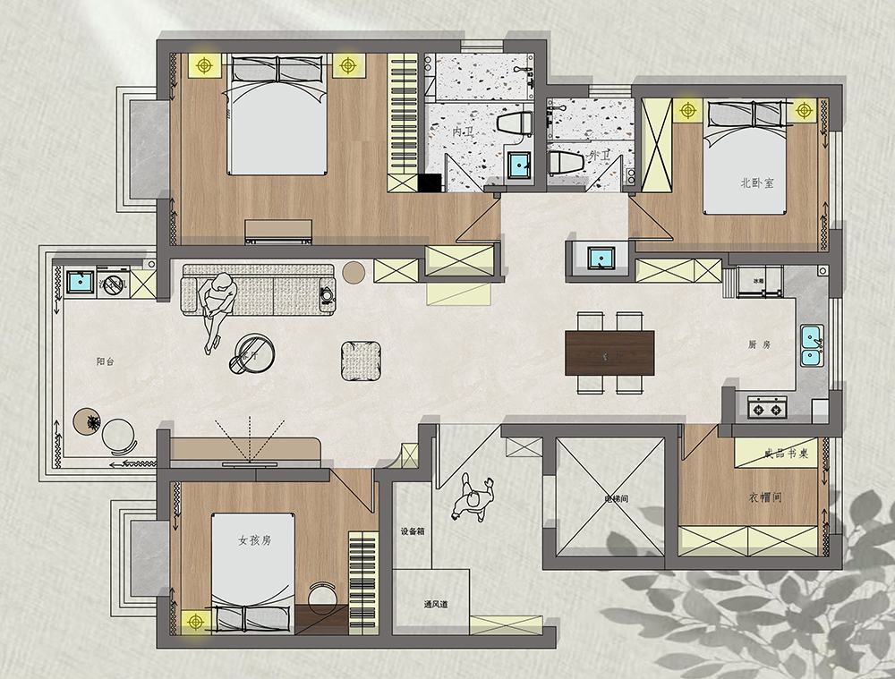 1.业主喜欢南北通透,尽量增加公区的使用面积,设计师打通公区,贯穿南北,开放式的格局让整个房子视野都打开了。