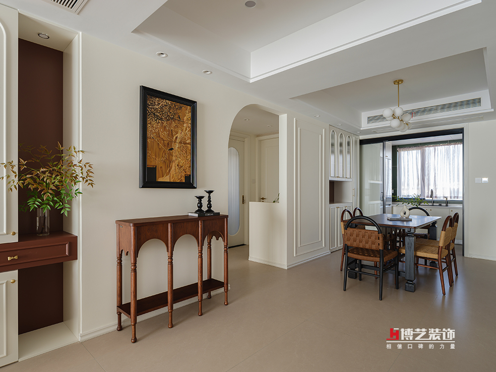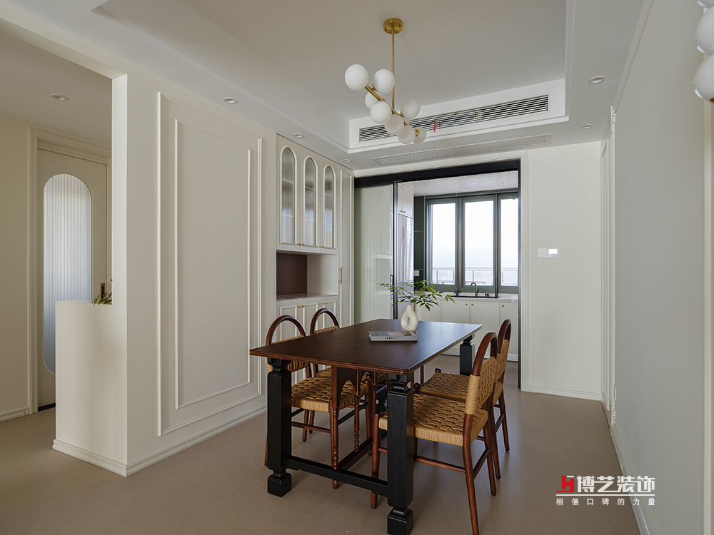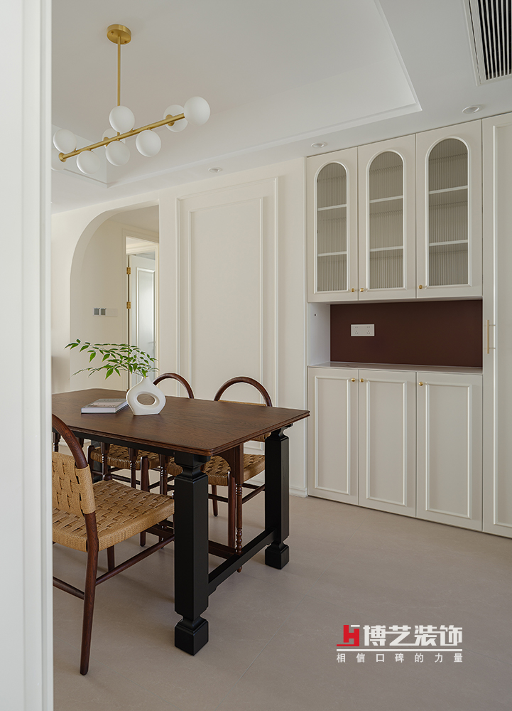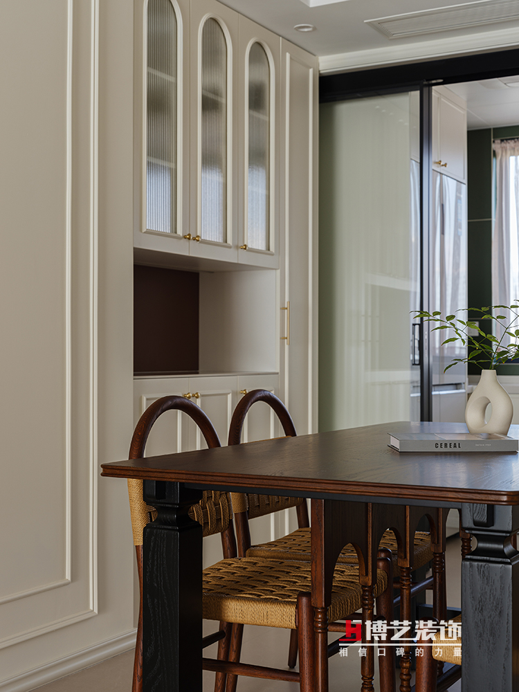 随着晨光缝隙,轻轻洒在藤编复古餐椅上,新的一天在缓缓苏醒。在这里,每一次用餐都变成了一场视觉与味觉的双重盛宴。藤编餐椅与核桃木餐桌的结合,奶油色餐边柜与长虹玻璃柜门的碰撞,共同编织出一个既复古又现代,既温馨又雅致的用餐空间。在这里,每一次的举杯,都是对生活美好的致敬,每一次的交谈,都是对时光流转的珍惜。