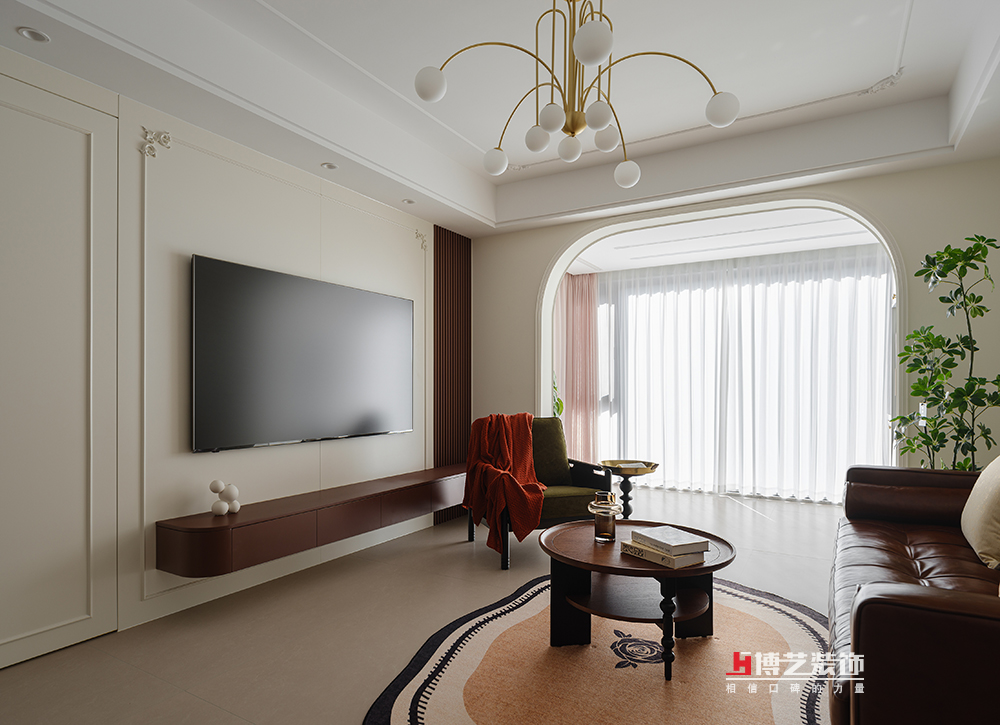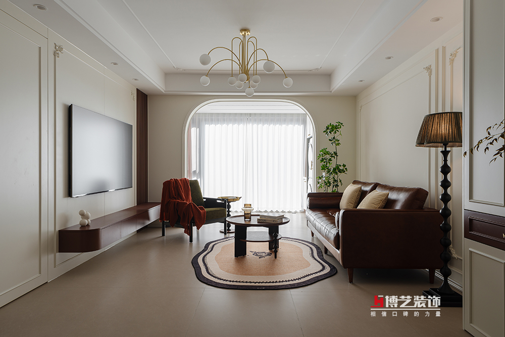 咖啡色的真皮沙发,它以优雅的弧线和柔软的质感,邀请你坐下,享受一段慵懒的午后时光,让人不由自主地放松下来。客厅的一角静静地站立一盏落地灯,似在时光里沉思,用温暖的微光诉说无声的故事。电视柜的设计简约而不失格调,悬浮的设计让它看起来轻盈而时尚,也让整个客厅空间更加开阔。