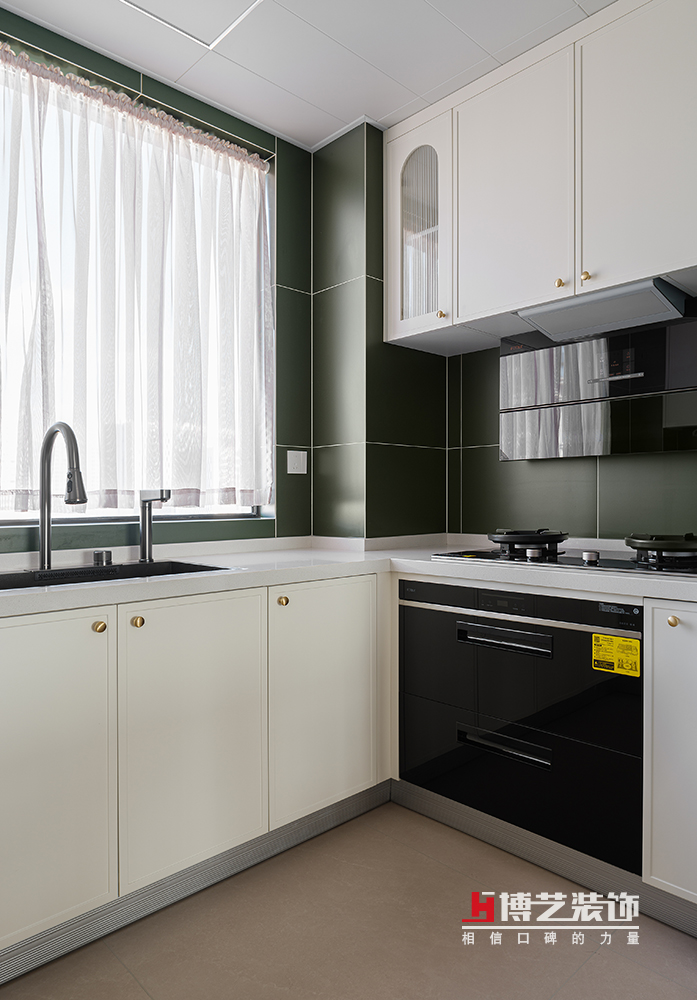 当阳光透过轻盈的纱帘,洒在墨绿色的砖墙上,不仅为厨房增添了朦胧的美感,也平添了厨房的温馨与舒适。那些墨绿色的砖块,仿佛是时间的见证者,它们以沉稳的色彩和质朴的质感,为这个空间注入了一种复古而又现代的魅力。同时又与奶油色柜门的柔和与细腻形成了鲜明的对比,共同编织出了一个既复古又现代,既沉稳又轻盈的空间。