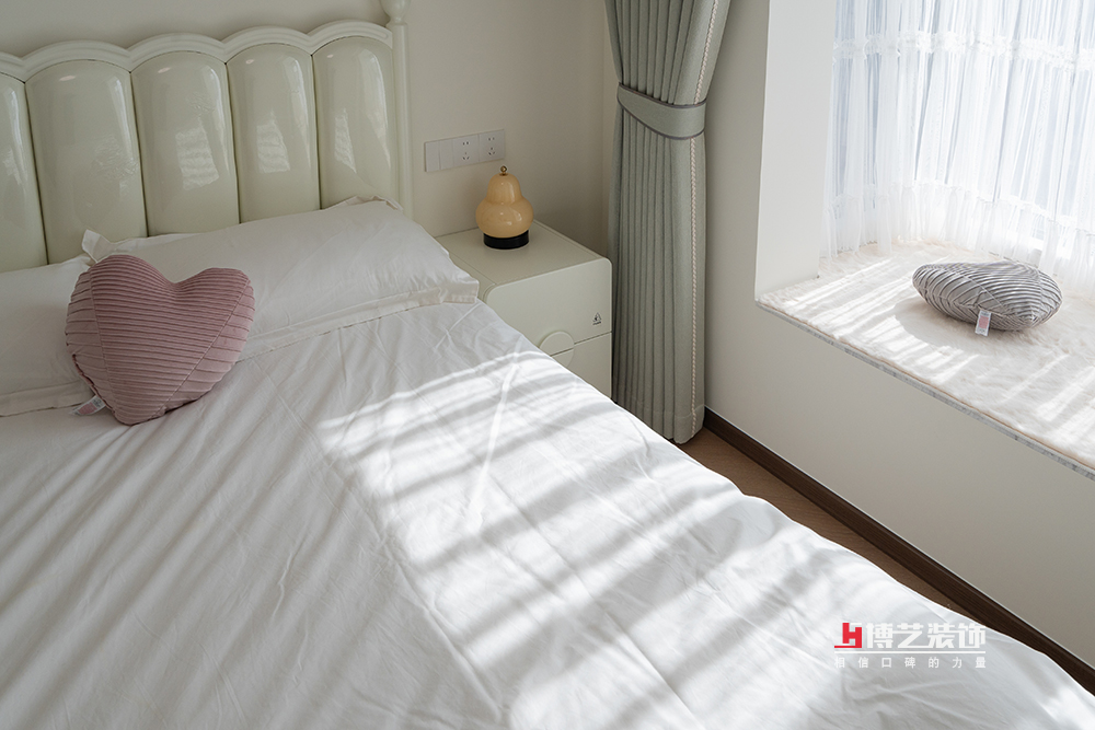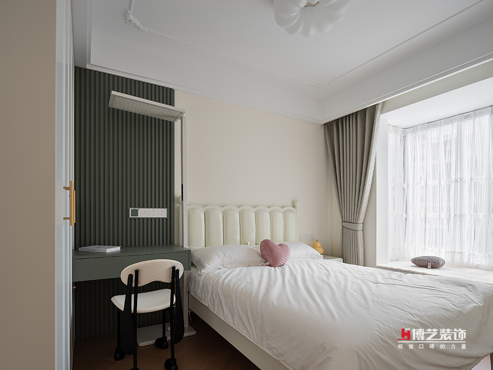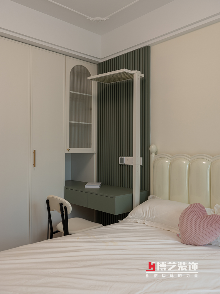 薄荷绿和奶油色交织成了清新雅致的次卧。当午后的阳光轻柔地穿过纱帘,洒在奶油色的墙壁上,次卧的每一个角落都被温暖和宁静所填满。这个空间,仿佛是一首温柔的诗,每一行都充满了家的温馨和舒适。