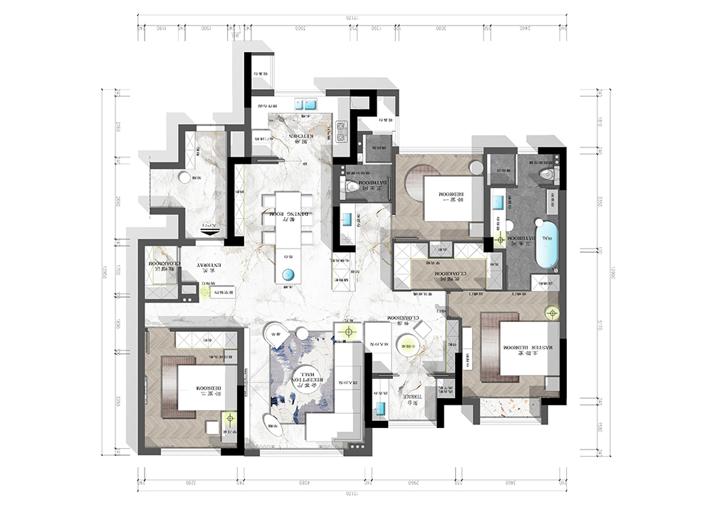 2.进门的区域借用南次卧的空间,打造玄关及鞋帽区,鞋子收纳,次净衣区地打造让回家的仪式感拉满;