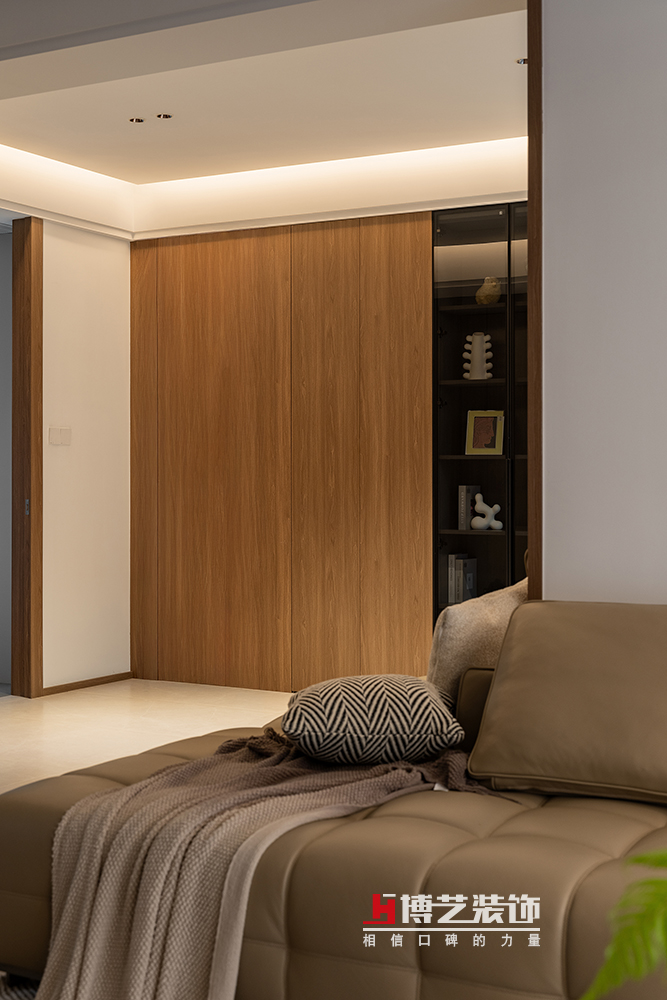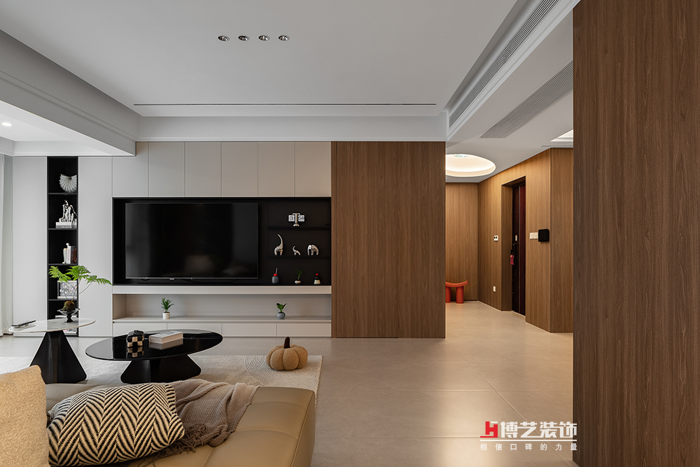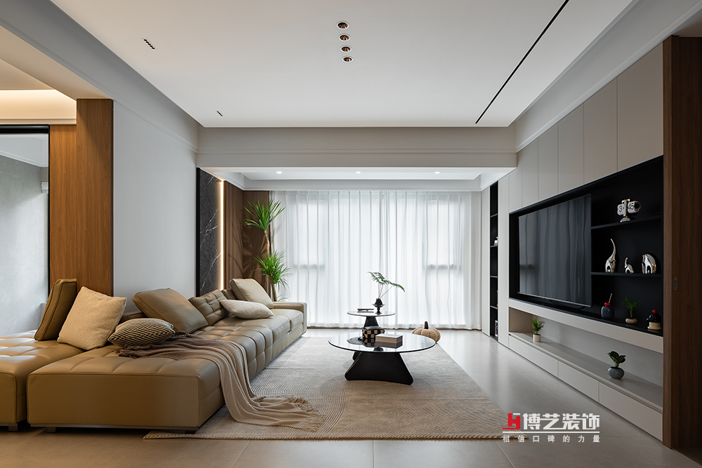 客厅采用极简的设计手法弱化空间内的棱角,开拓视野,采用大地色系的木作、皮革、编织填充、柔化色彩,提升家的温馨感。