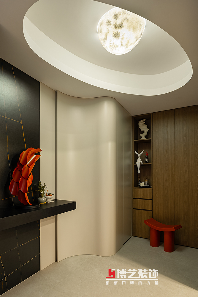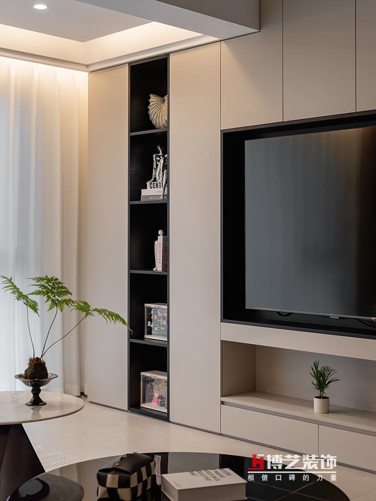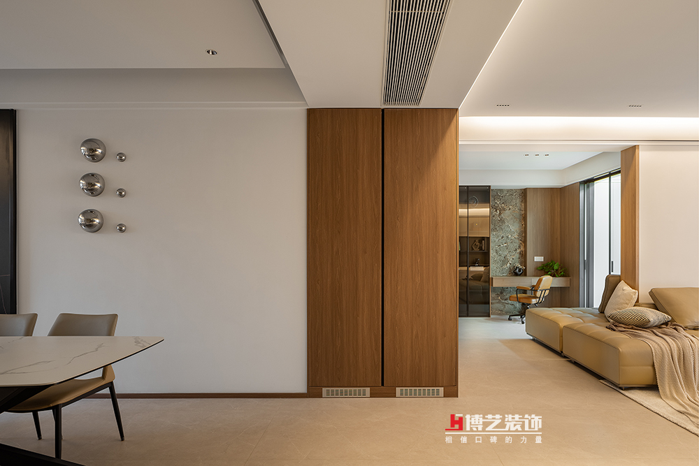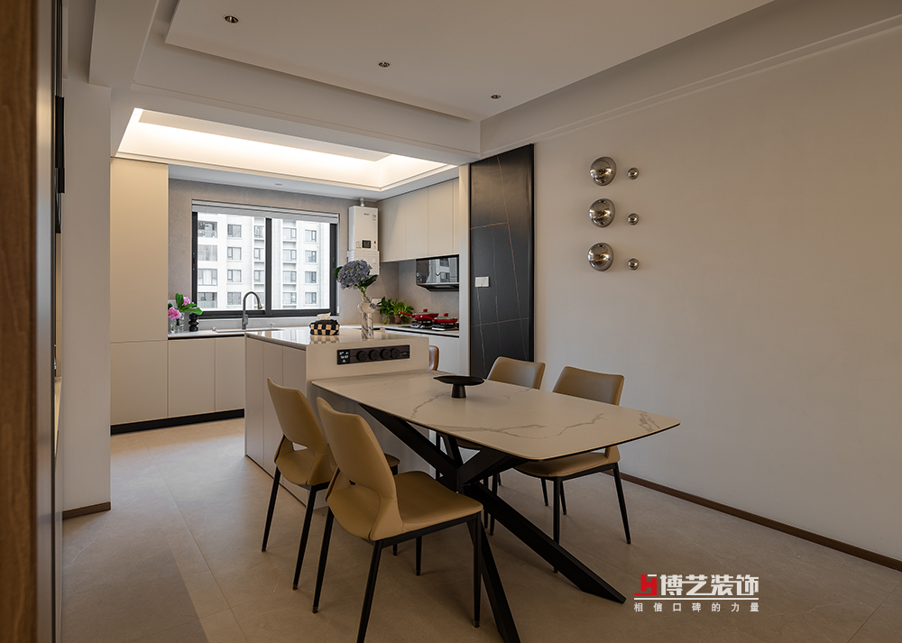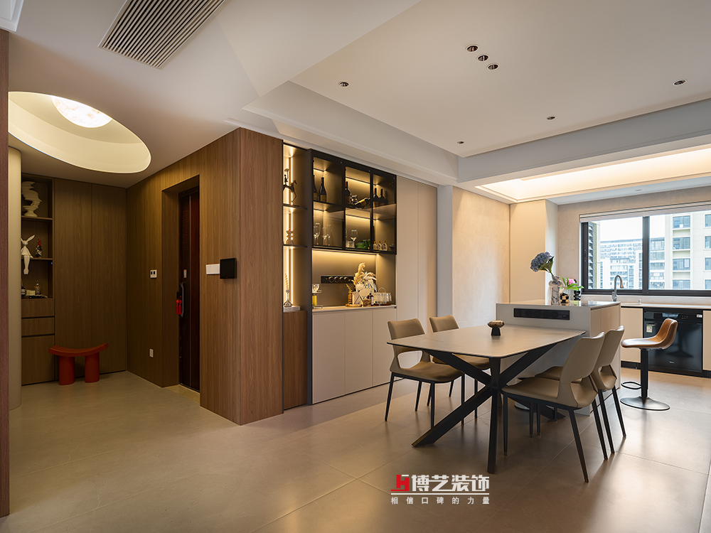 扩大餐厅空间后,餐导一体的打造让就餐仪式有了多种选择。在餐边柜的打造上,则采用“藏露结合”的方式,满足颜值,实用等多种功能,实现让收纳也成为空间美学的一部分。