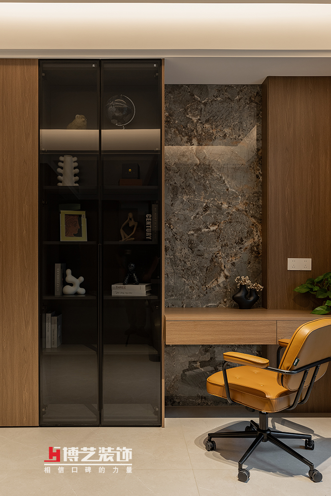 客厅与书房相连,重新划分的休闲区、阅读区、家政区,让客厅一下承载了更多的功能性。白色和木色相得益彰,营造出温暖而又整洁的氛围。原木的光泽在灯光的照射下泛着细腻的微光,大理石用他强大的包容性轻轻接纳,给人一种安定的力量。