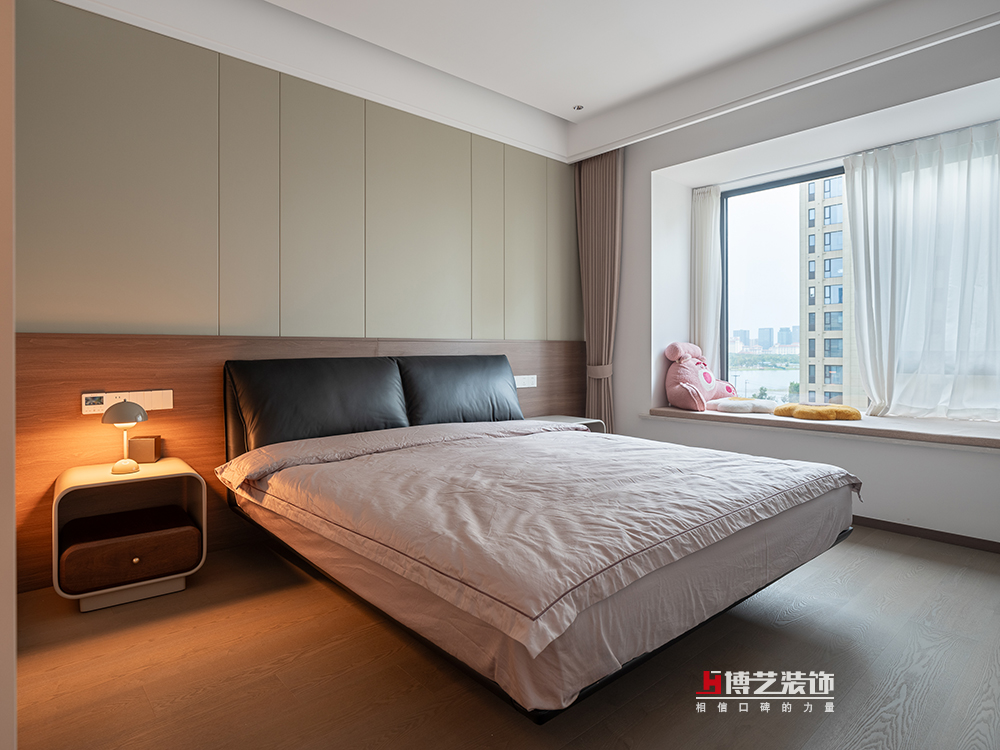 相对公区的绝对开放格局,主卧则是仿佛布下了温柔私密的结界。超大的落地玻璃窗景将阳光折射成光影,让主卧一年四季都有不同的风景。