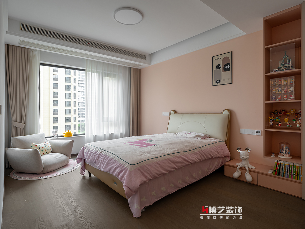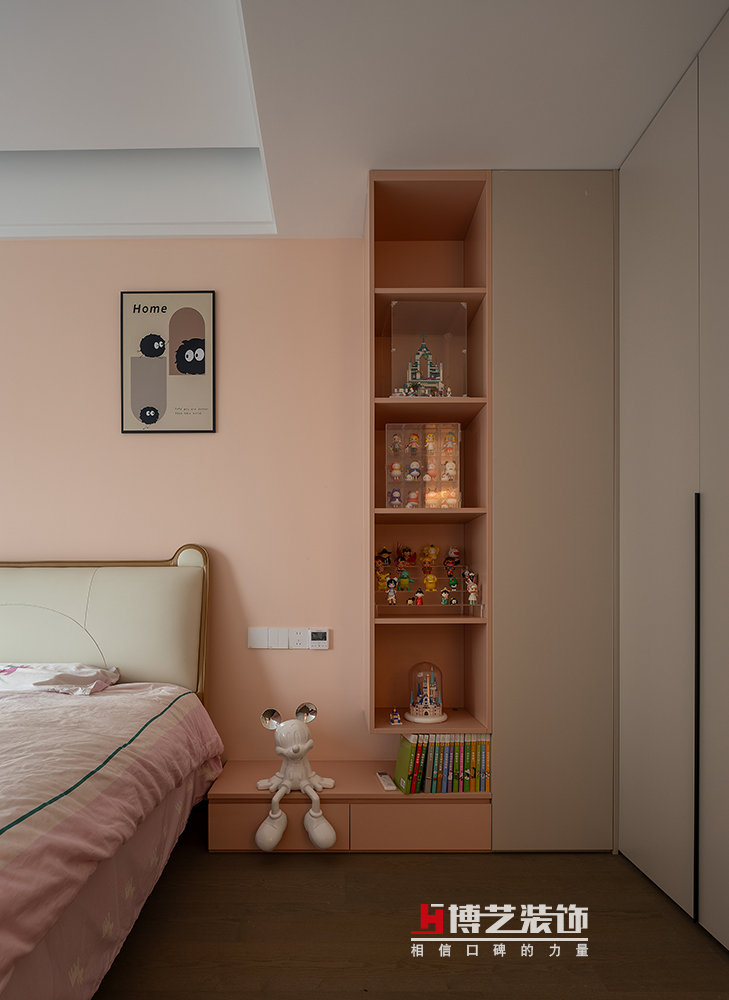 通过隐形门进入另一方天地,儿童房并非传统意义的“小房间”,这里是一个充满互动性的成长空间。考虑到孩子的成长需求,设置成了学习区,阅读区,玩乐区,睡眠区,收纳区等等多功能区域,另外采用可以灵活调整的布局来设计。