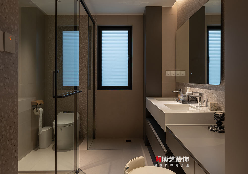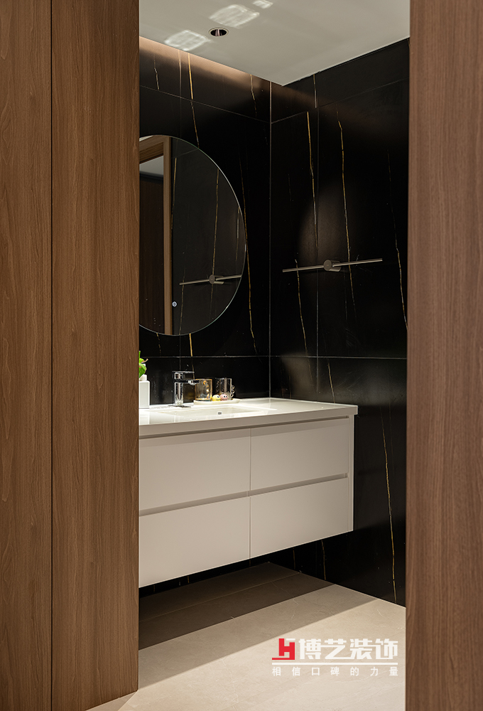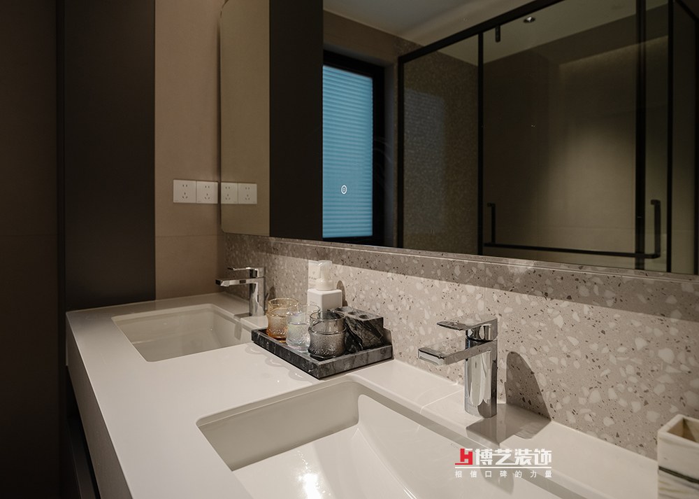 5.借用原有的过道位置,打造衣帽间,与主卧打通形成一个大套间。同时借用主卧衣柜的空间,扩大主卫的使用面积,嵌入梳妆台,淋浴区和收纳区,使得主卧的舒适性更强。