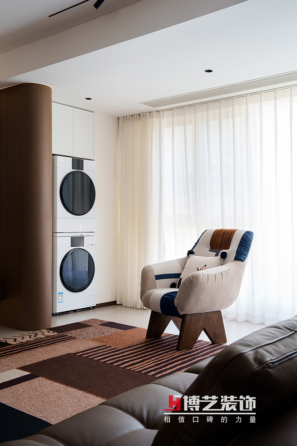 进入客厅,第一眼便被这复古又明亮的空间所吸引,自然光透过纱帘洒入室内仿佛自带一层美颜滤镜。白色的顶面,深棕的沙发与地毯,由浅到深的层次感仿佛自然在时光中的沉淀。