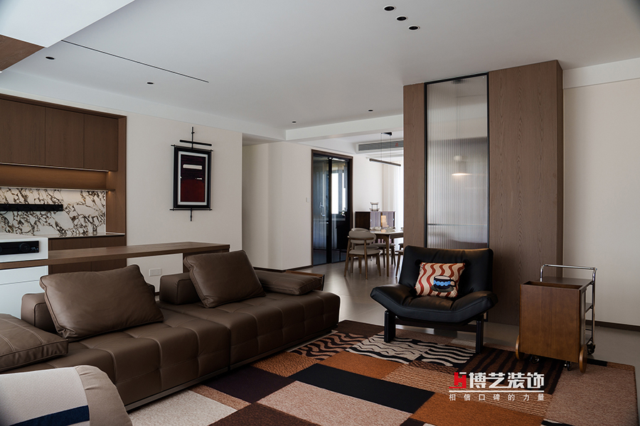 玄关木饰面与长虹玻璃的造型演变成沙发背景,小吊灯金属的质感在朦胧中透出几分灵动。
