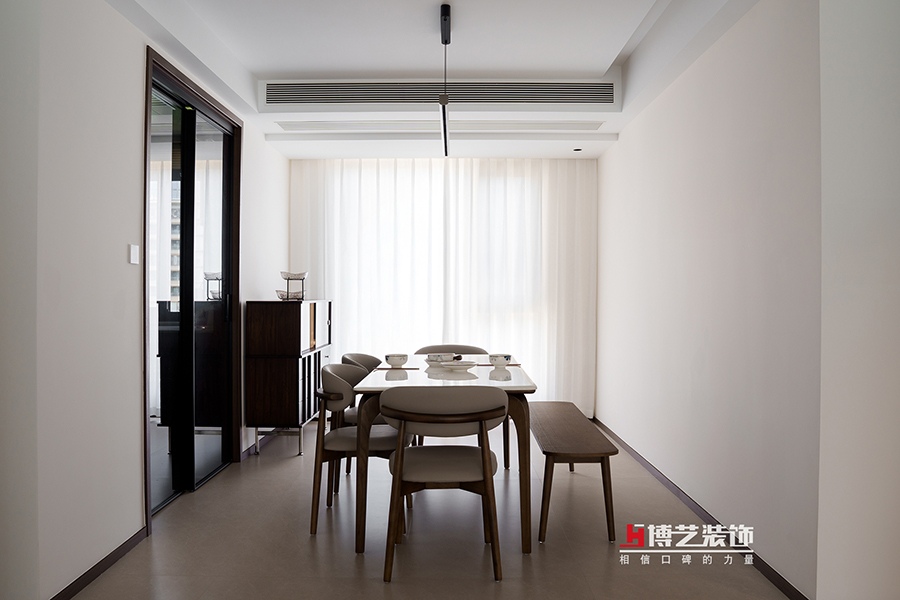 “无色”的白色场域里,通过光渲染不同的柔性,搭配与客厅同色木材的餐桌椅,构成一个简单温馨的用餐环境。