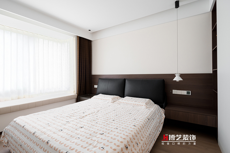 主卧以棕色木饰面为背景,搭配黑色皮质床靠,简约中透出高级。无主灯的设计搭配床头的吊灯,营造静谧舒缓的入睡氛围。