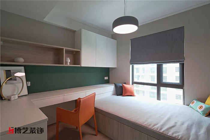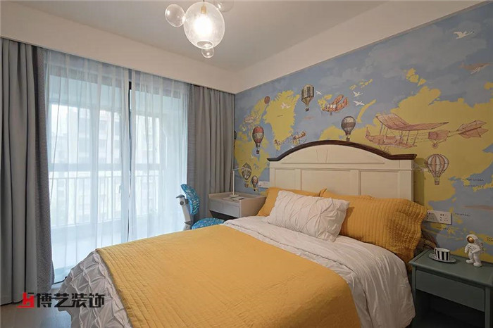 我们深知生活环境对于培养孩子的秩序性,自律性的重要性,所以我们着重在儿童房打造了睡眠区,学习区和储物区。而对于男孩子来说,太空遨游是每个男孩子的梦想,而大多数的创造力都来自孩子的好奇心和冒险精神,所以设计师选用了遨游太空的壁画,让冒险精神在孩子心理扎根,让孩子从小就萌发大胆尝试和探索的勇气。