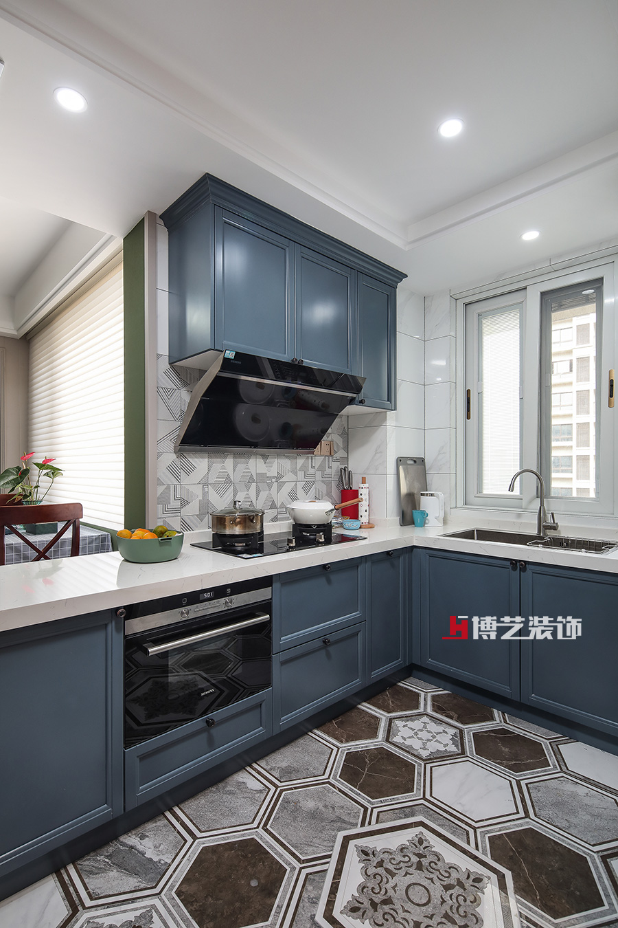 厨房地面和入户玄关的拼花砖把原本沉闷的深灰色地砖打破,配上灰蓝色的橱柜门板让人产生一种流连忘返的感觉,在厨房间为生活做着每一顿可口的食物都会不经意的看看地面。