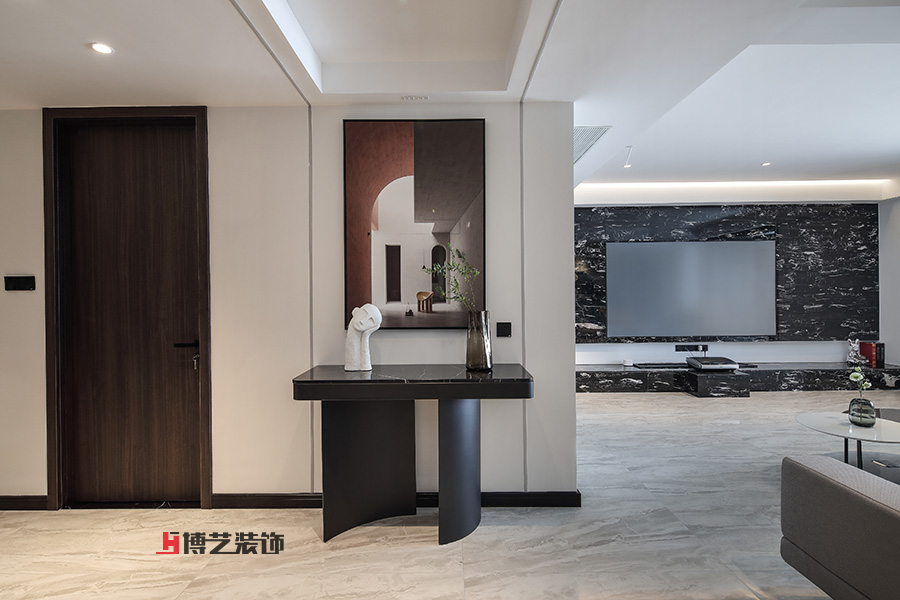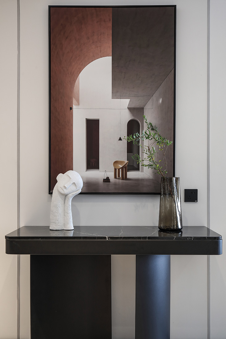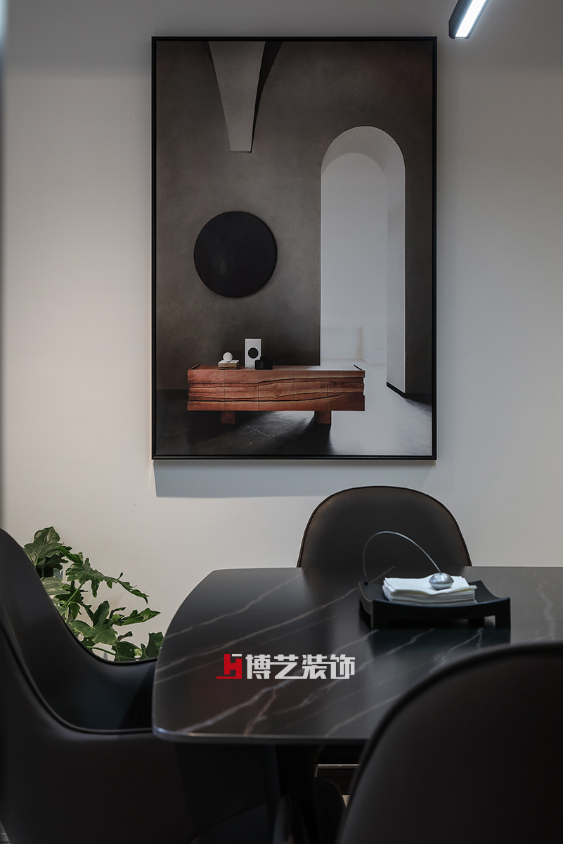 通过光线的晕染,让黑色不显沉闷,让软装更加舒适,黑色与米色平衡了环境中的色彩,增加质感。