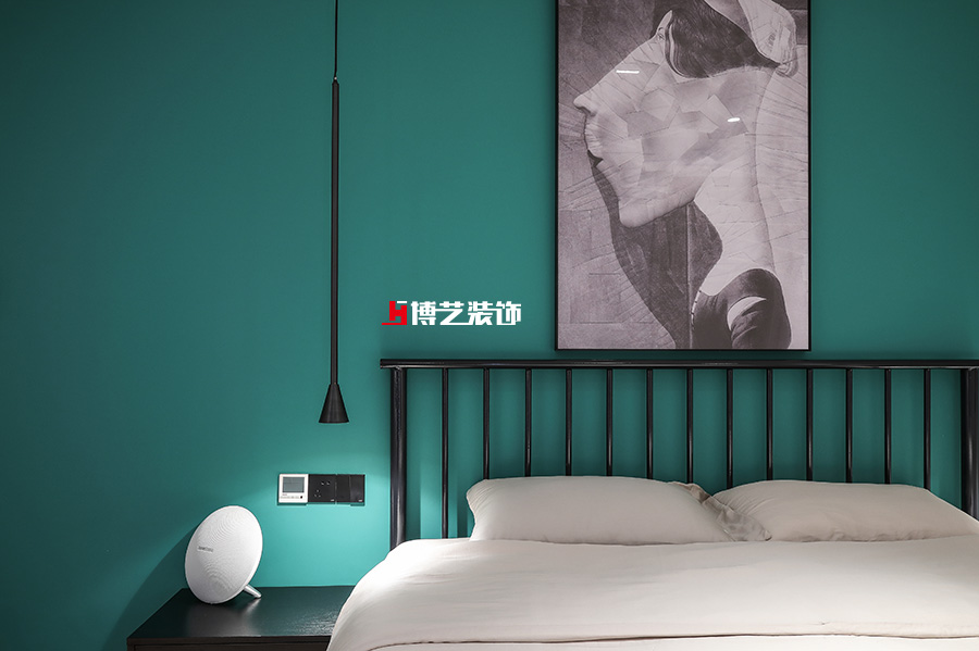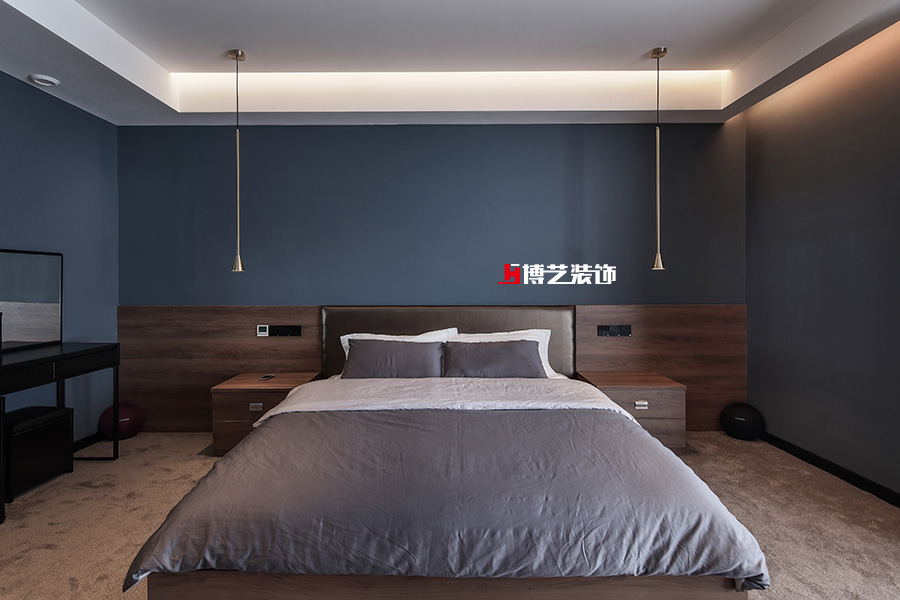 卧室采用蓝灰色墙面,搭配棕色木饰面与地毯,软硬结合,彰显主人气质。红色电视隔断又调整了空间的亮度,搭配简单的软装,不繁琐,不简单。