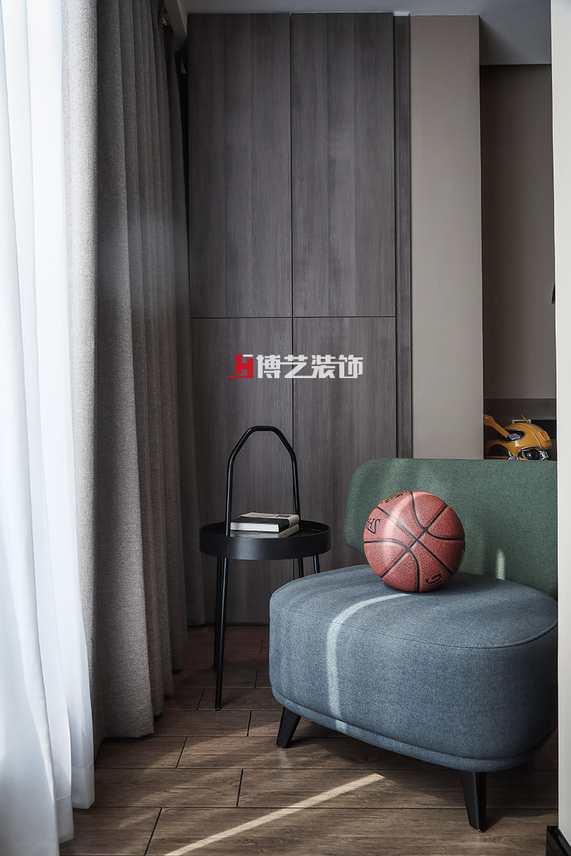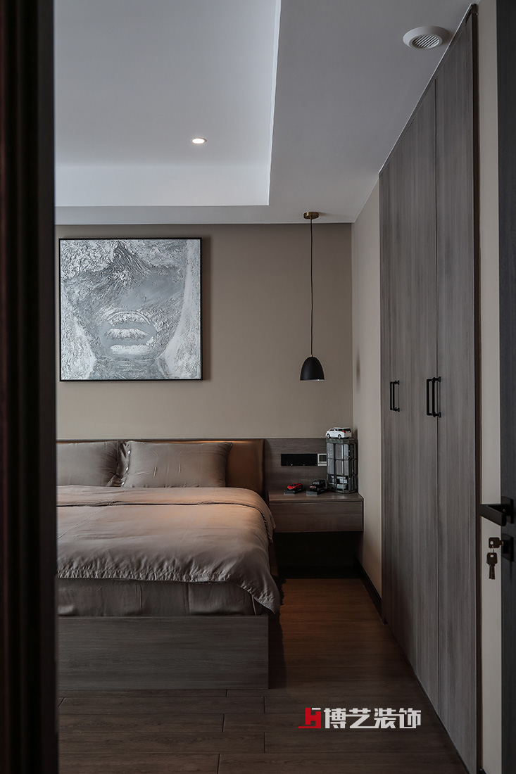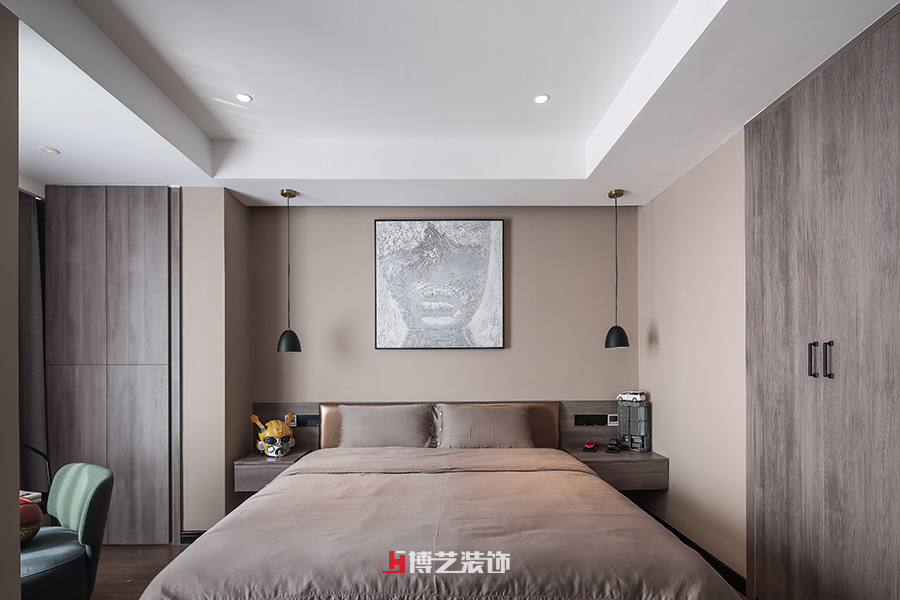 男孩子的房间则以咖啡色为主,从墙面到木饰面,不同的色调搭配出不同的层次,朴素又不失雅致。