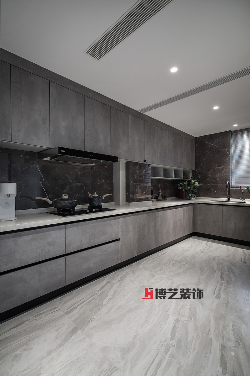 超长操作台的设计拉开了空间维度,温柔的灯光搭配灰色橱柜,烹饪的心情都变得愉悦很多。