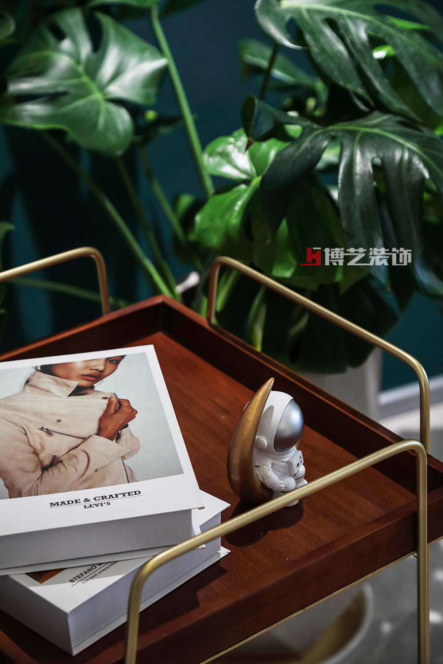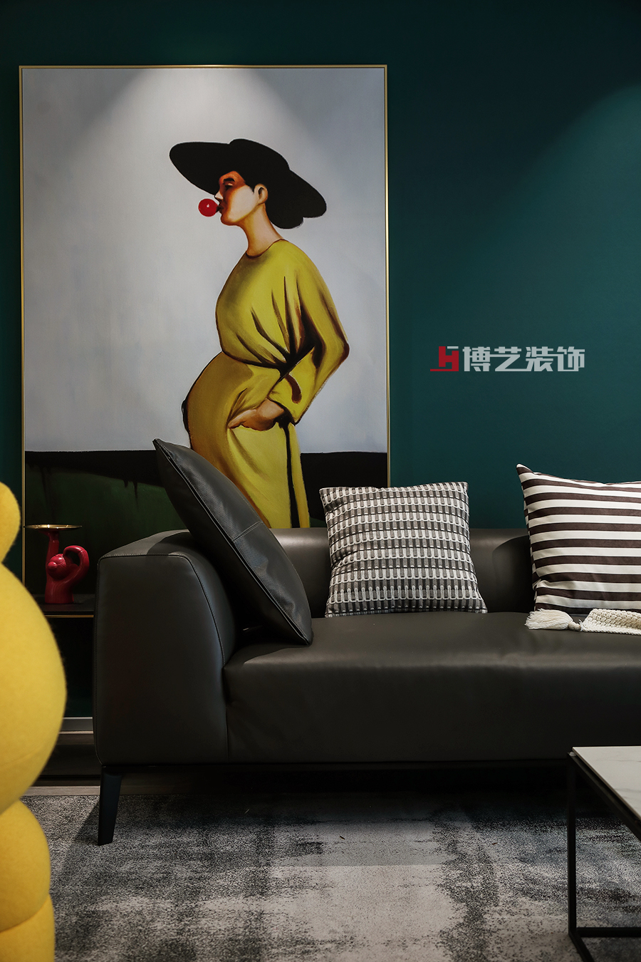 搭配着的软装,在墨绿的映衬下,红色更艳,黄色更灿,文艺轻奢的满满格调。