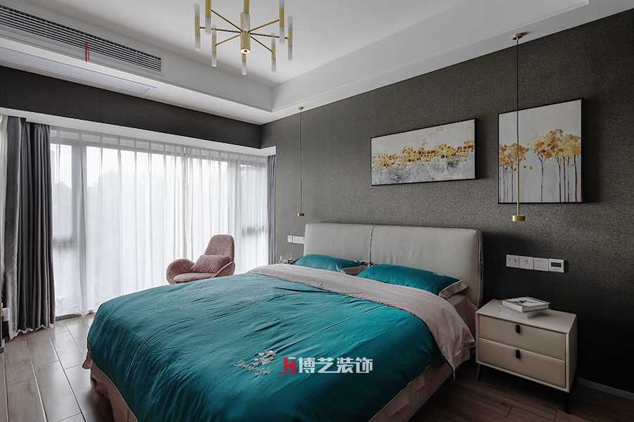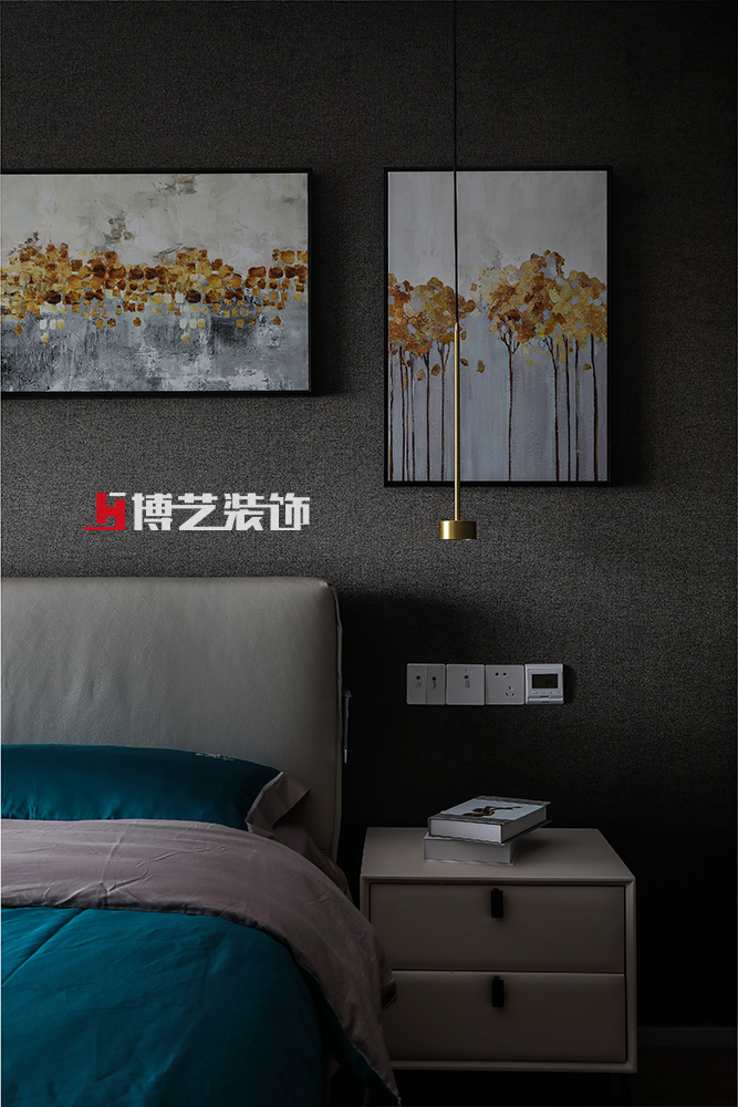灰色的卧室营造着慵懒的舒适感,搭配的绿色床品,增添了一抹灵动,仿佛在墨色中跳跃的精灵。