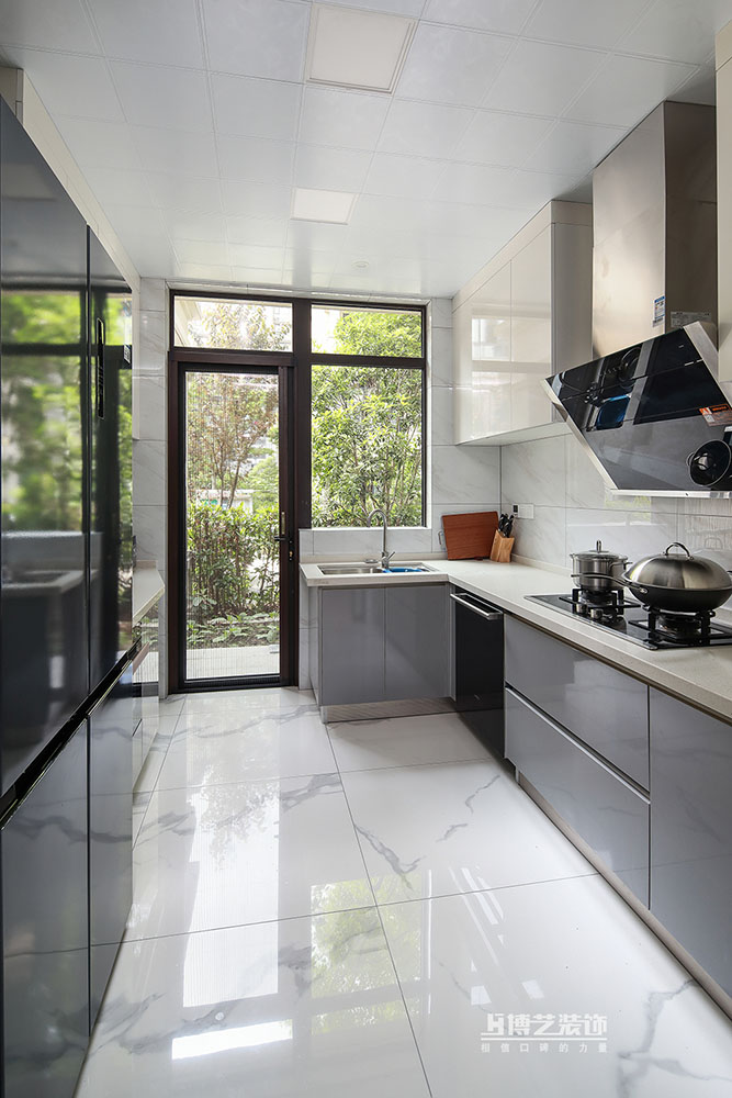 一楼主要是生活区域,包括厨房、客餐厅等。设计师利用北面阳台的区域,把厨房做后移,整个空间就形成了现在的南北通透的设计,痛风性更好,同时自然光也能更多的进入空间。