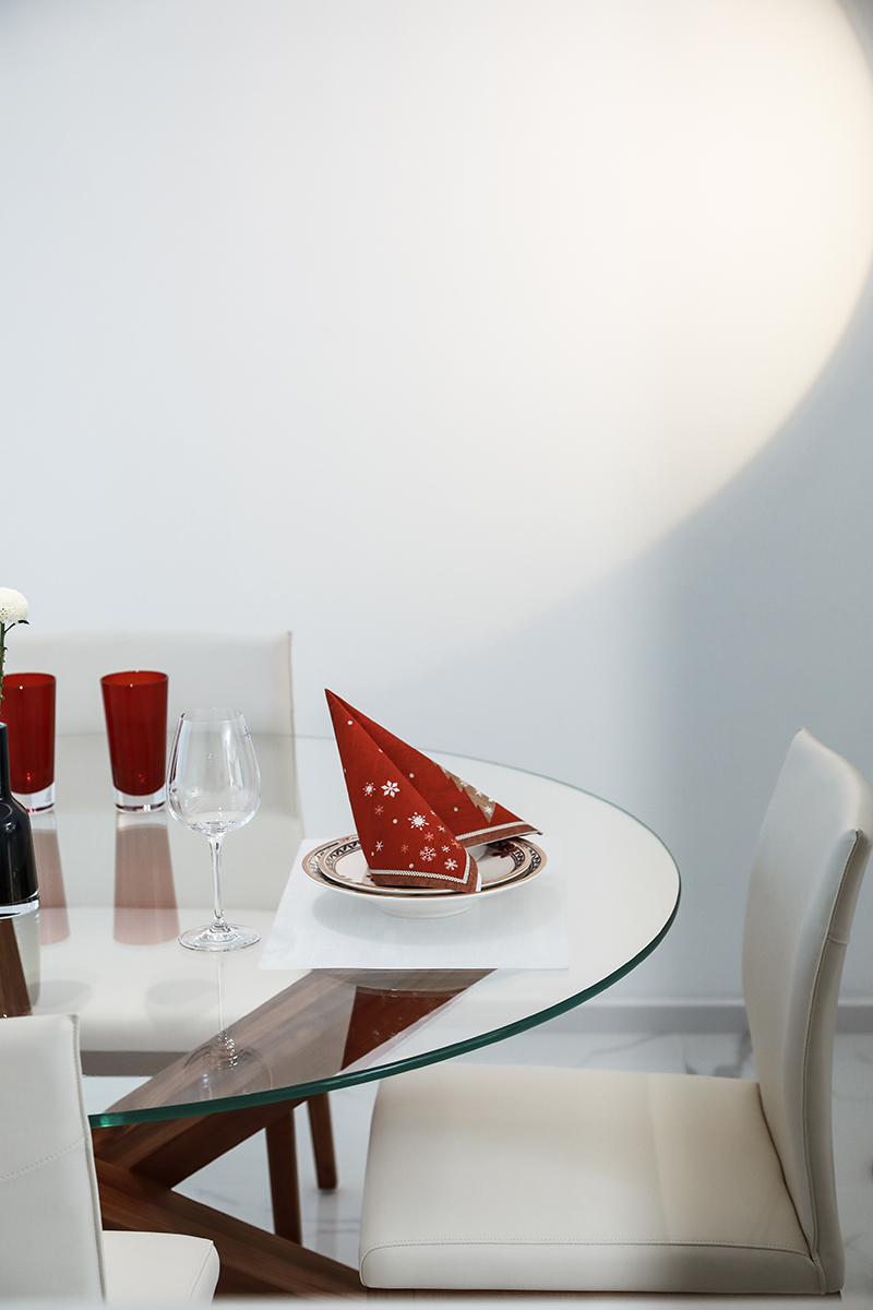 耀眼的红色与纯白的空间共鸣,把阳光带来放在墙上,生活的仪式感化为具象,美好的流连着驻足。